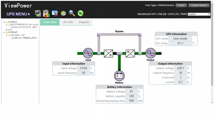 - динамічні графіки даних ДБЖ у реальному часі (напруга, частота, рівень навантаження, рівень заряду батареї) ),
