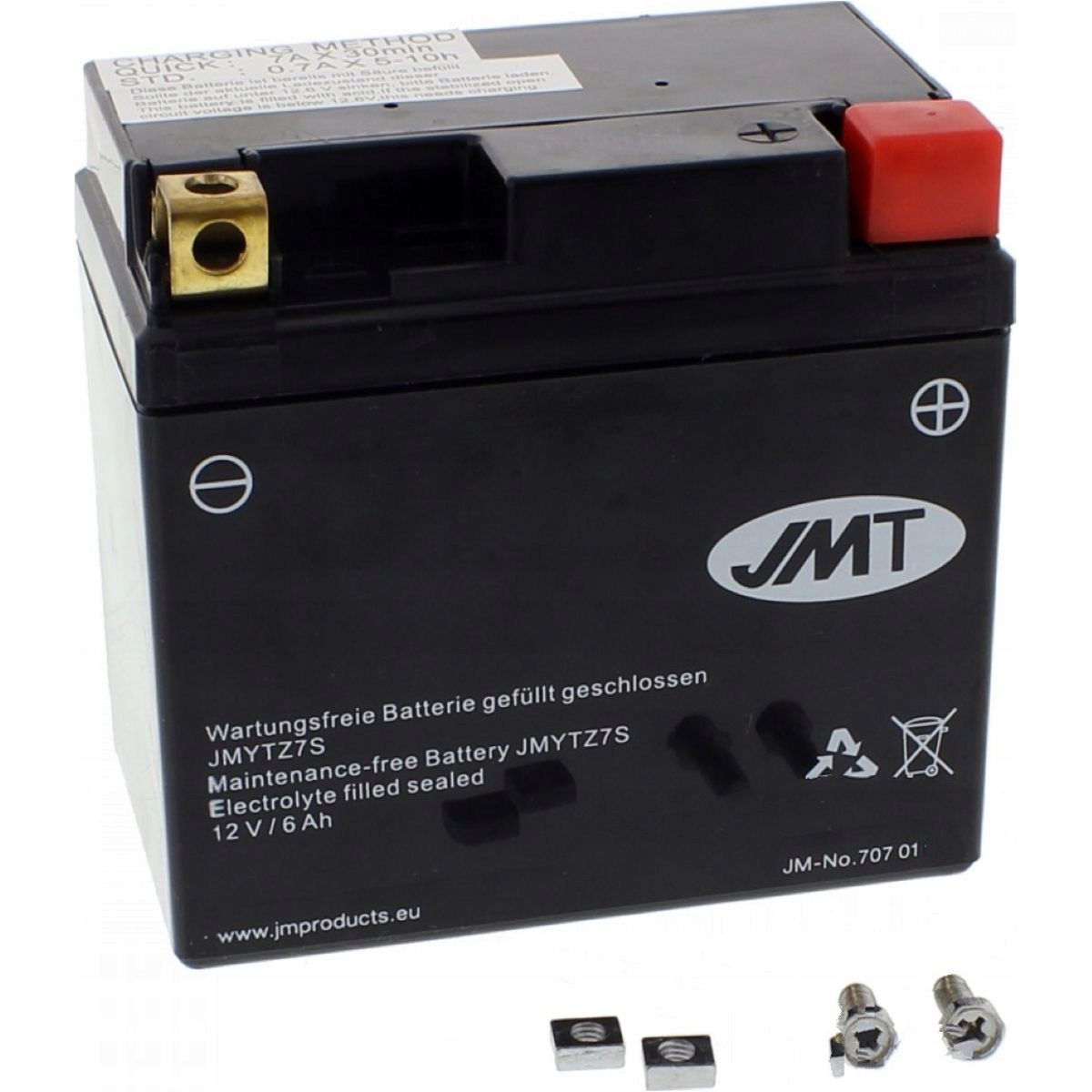 Акумулятор, що постачається з електролітним бака. Він не був активований, і після затоплення його електролітом слід додати відповідно до показань, описаних нижче. За останні кілька років акумулятори JMT повністю змінили обличчя. Завдяки використанню повністю автоматизованої виробничої лінії, в даний час виробляються акумулятори JMT, представляють найвищий глобальний технологічний рівень. Відносно низька ціна означає, що акумулятори JMT є найкращим рішенням на ринку мотоциклістів. . Рівень заряду можна перевірити альтернативно за допомогою метра напруги. Якщо це 6,1 В (6 В акумулятор) або 12,2 В (12 В акумулятор), акумулятор повинен бути наповнений рівним або менше 1/10 ємності акумулятора. Приклад: акумулятор 8AH повинен бути заряджений значенням 0,8 a.