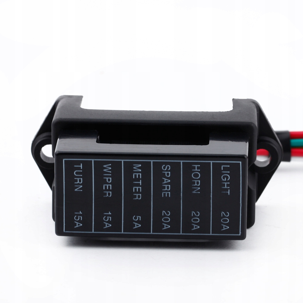 Цю 6-контактну коробку запобіжників у міцній конструкції можна використовувати в автомобільній промисловостіелектронних полях, автоспорті, електроприладах, причепах, автомобілях, човнах тощо. Поставляється з 8 проводами (два вхідні та 6 вихідних проводів).