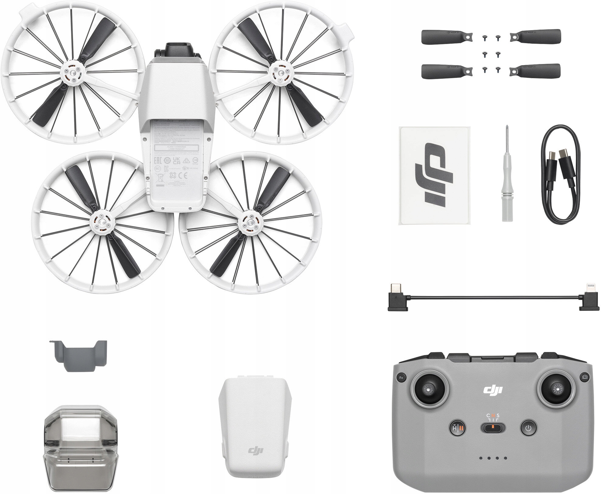 Упаковка містить: безпілотник dji flip , dji rc-n3 управління, інтелектуальний акумулятор, кришка гімбалу, кілька гвинтів з гвинтами, викруткою, usb-c зарядного кабелю-usb-c, usb-c cable-usb-c та посібником користувача.