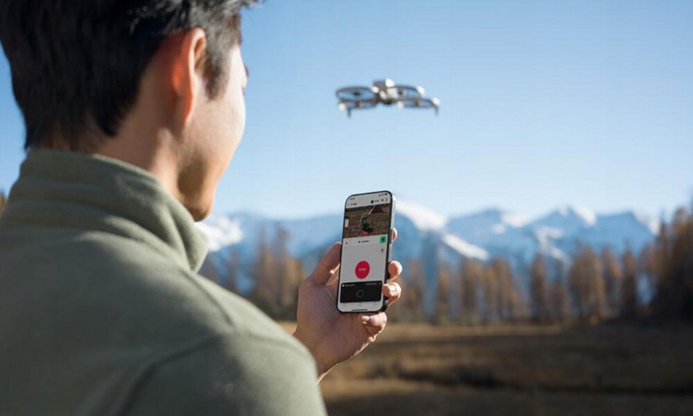 Не потрібно використовувати контролер для управління dji flip . Підключіть його з додатком DJI Fly , використовуючи Wi-Fi Пряме з'єднання . Інтуїтивно зрозумілий інтерфейс дозволяє одна рука управління та легкий перемикання між режимами запису. Крім того, пристрій підтримує голосові команди - просто активуйте функцію за допомогою команди "Hey Fly" та видаючи подальші голосові інструкції. Після поєднання з телефоном безпілотник також може записувати звук і автоматично зменшити шум, що генерується робочими гвинтами , що покращує якість записів.