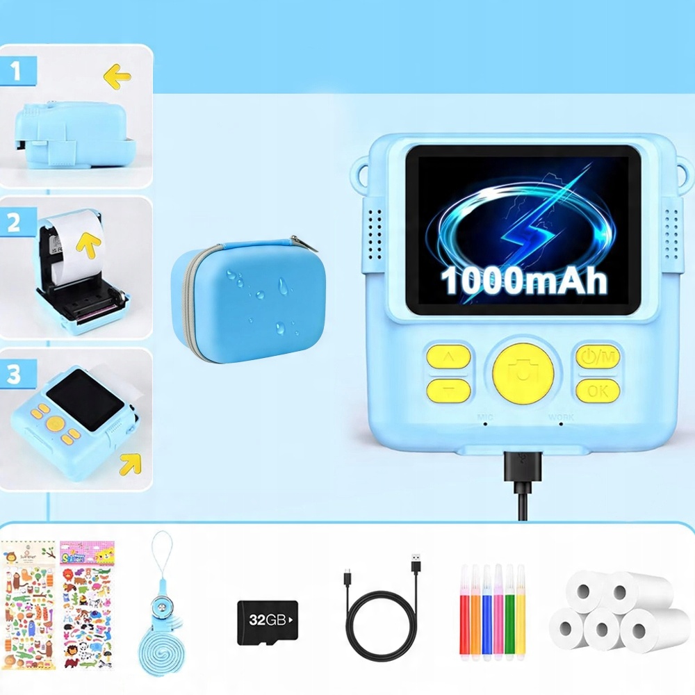 📷 【Повні аксесуари】: повідок того ж кольору, зручно носити камеру дітьми; 32 ГБ Micro SD -карти не потрібно купувати окремо; 6 барвистих олівців дозволяють дітям використовувати свою уяву та творчість на друкованих чорно -білих фотографіях.