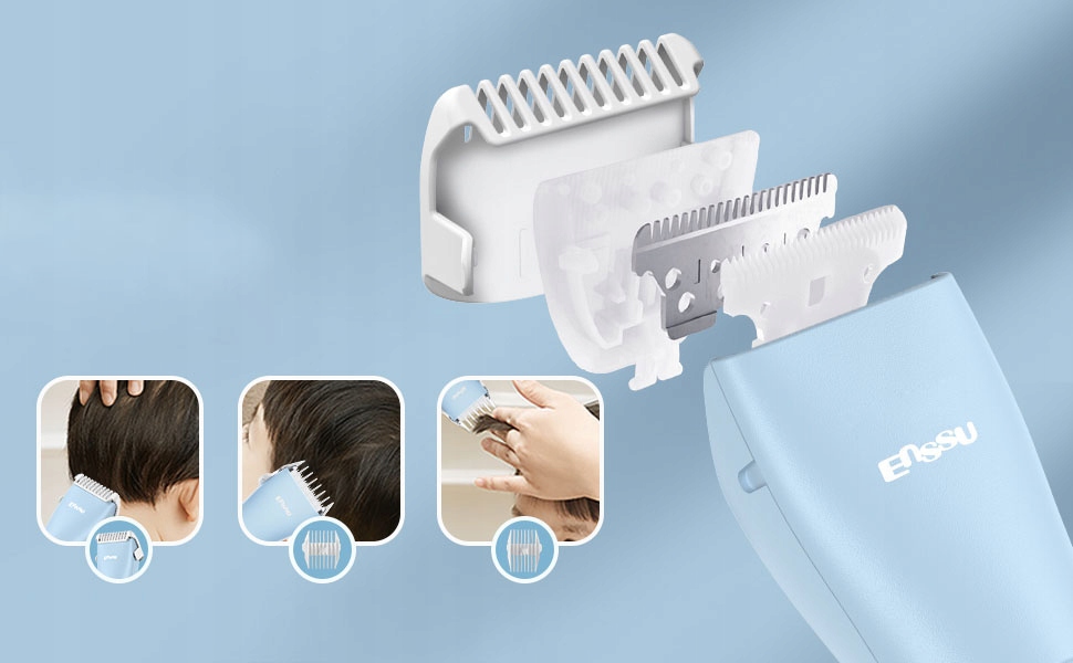 - Машинка для стрижки волосся оснащена трьома напрямними гребінцями, які адаптуються до потреб волосся різної довжини (3/6/9/12 мм). Направляючий гребінець товщиною 1 мм спеціально розроблений для немовлят і малюків, щоб забезпечити додатковий захист шкіри та запобігти травмам.