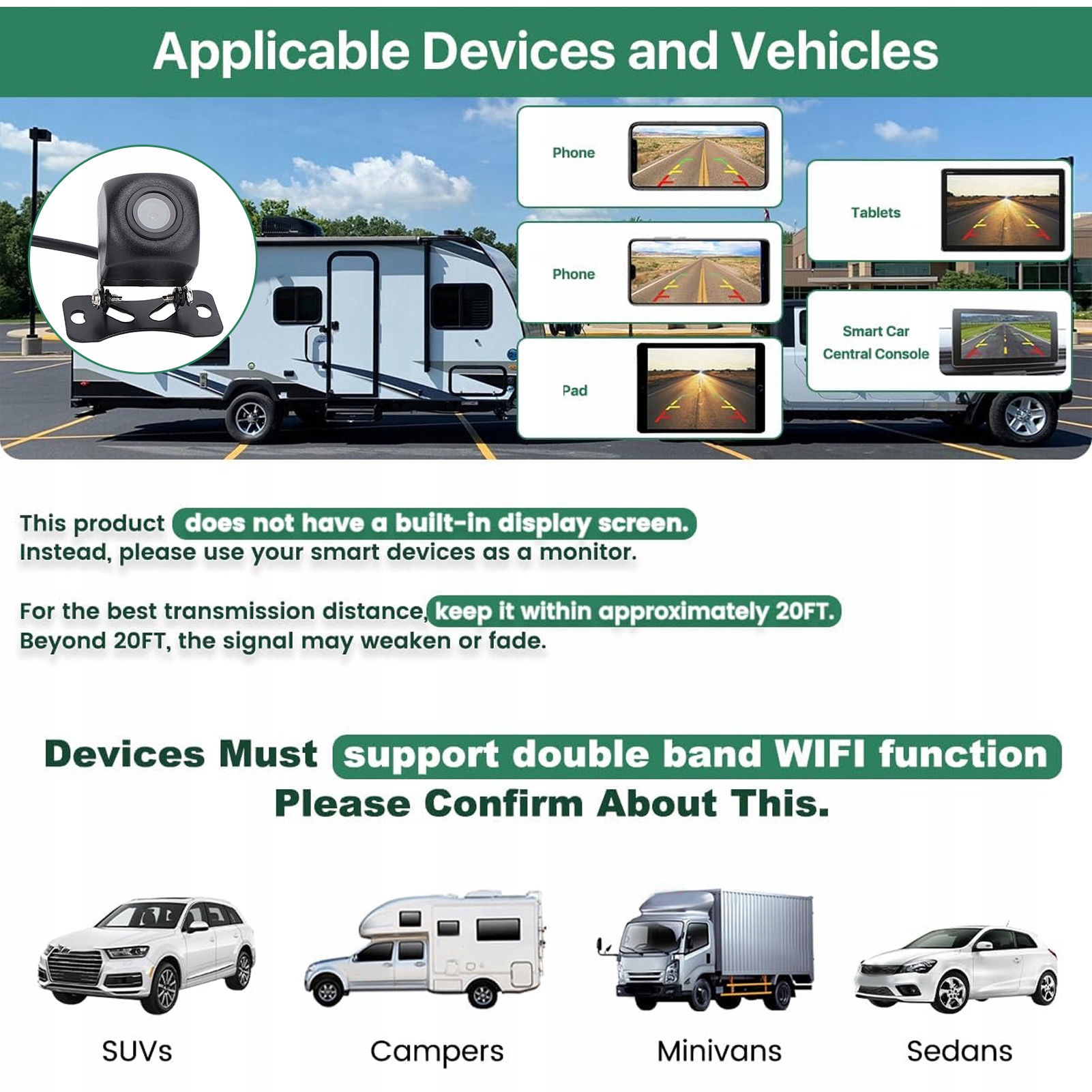 1. Камера, що повертає бездротову вірність: Наша телефонна камера, що повертає камеру, бездротова Fididelity 2.4 G, ідеально працює з коротшим часом реакції, стабільною передачею відео -сигналу та нульовою підвіскою зображення. Він має роздільну здатність 1080p HD, широкий об'єктив типу риби 175 градусів та водонепроникний IP67, спеціально розроблений для невеликих транспортних засобів (менше 26 футів). Ідеально підходить для пасажирських автомобілів, седанів, невеликих вантажівок, будинків, позашляховиків, кемпінгових транспортних засобів тощо.