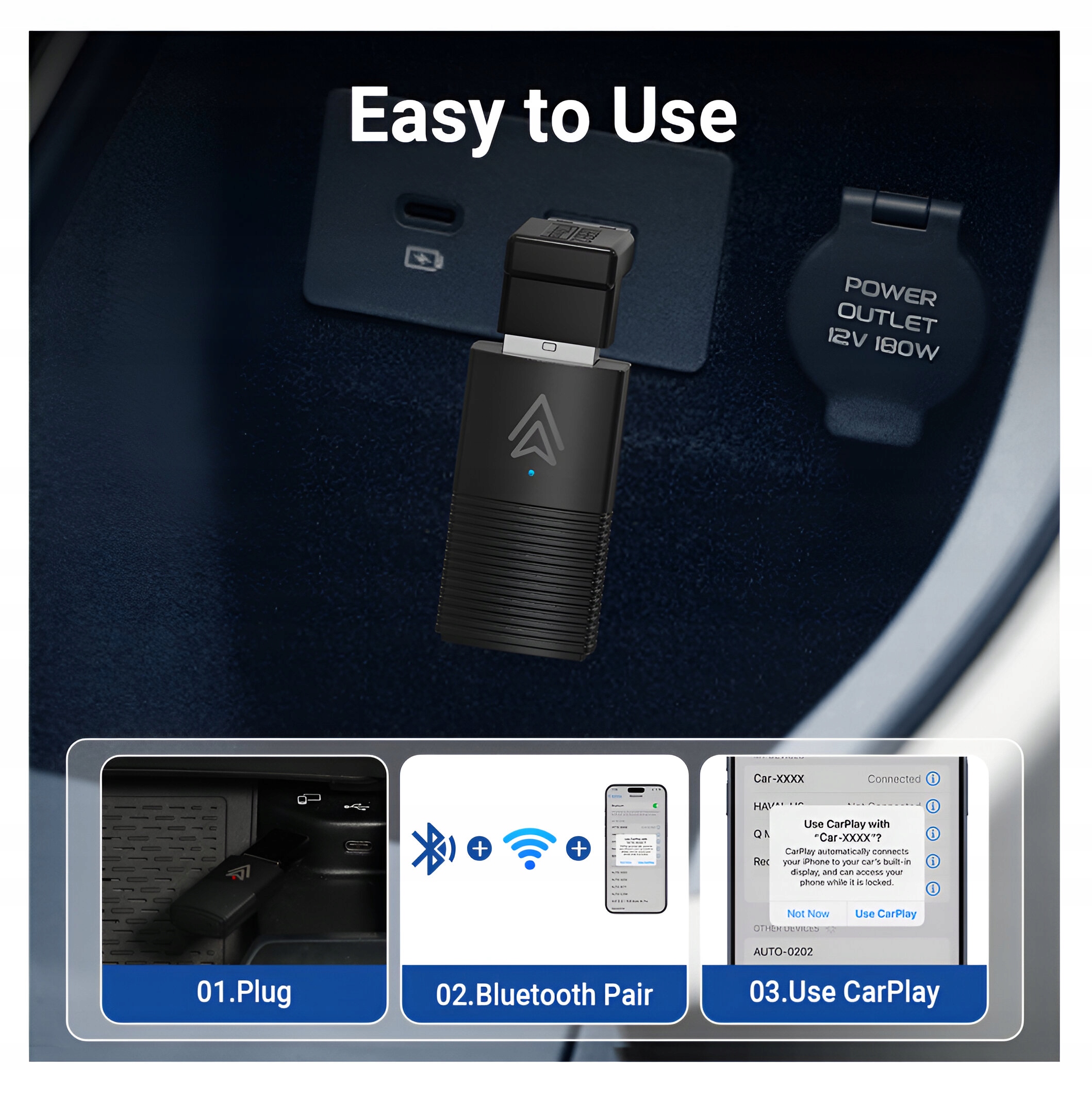 - адаптер працює з майже тисячею моделей автомобілів із доступом до системи CarPlay, зокрема: Audi, Porsche, VW, Kia, Toyota, Honda, Nissan, Ford, Lexus, Hyundai, Volvo, Cadillac, Chevrolet, Citroen,