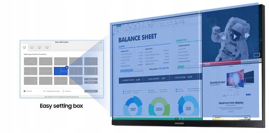 Завдяки < option b>Easy Setting Box ви можете розділити екран або відобразити кілька екранів із різними розмірами та орієнтаціями. Функція Picture-by-Picture дозволяє переглядати вихід із двох пристроїв. Це дозволяє краще справлятися з проблемами, пов’язаними з одночасним виконанням багатьох процесів.