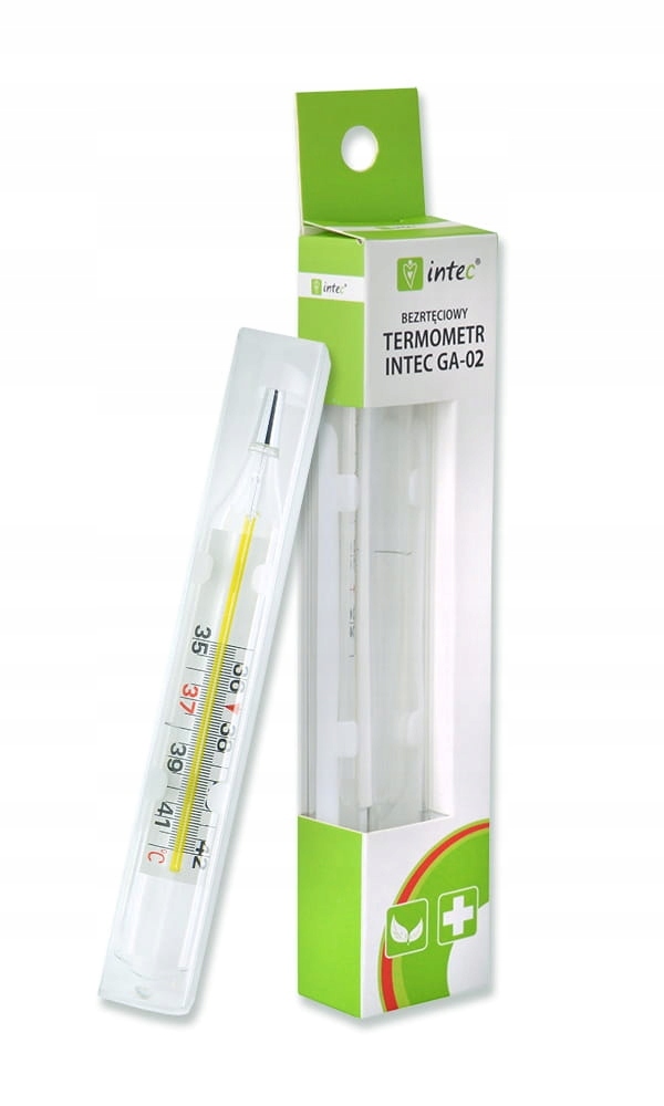 Безртутний термометр Intec GA-02 - це повністю безпечний, функціональний і простий прилад для вимірювання температури. Температуру можна вимірювати в роті, під пахвою/пахом або ректально в діапазоні від 32 до 42°C. Точність 0,1°C. Термометр має особливості традиційного термометра для вимірювання температури людини. Він не містить ртуті, не має електроніки, а отже, і батарейок. Це робить його дуже екологічним і може використовуватися дуже довго. Щоб легше було зчитувати температуру, термометр оснащений футляром зі збільшувальним склом.