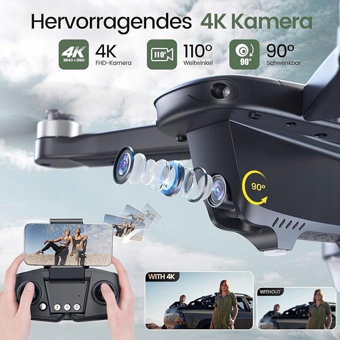 - Чудова камера 4K HD: складаний дрон оснащено камерою 4K , FOV 110° і регульована вісь камери 0-90°, що забезпечує чіткіші фотографії HD і більшу площу красивих пейзажів. Пропонує огляд 0-90° вниз з висоти пташиного польоту з прямою трансляцією 5G на екрани мобільних телефонів.