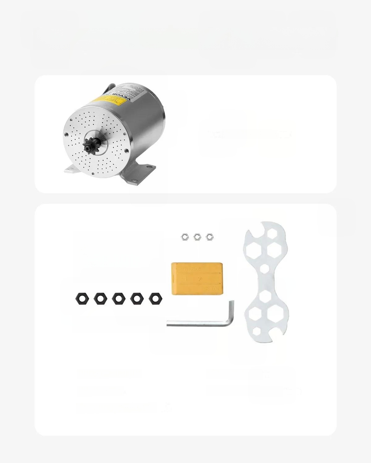 Комплексний набір для складання включає, серед іншого: 1 двигун 48 В 1800 Вт і повний набір гвинтів, гайок, шайб, шестигранних ключів і спеціальних ключів – усе, що потрібно для швидкого встановлення та надійного кріплення.