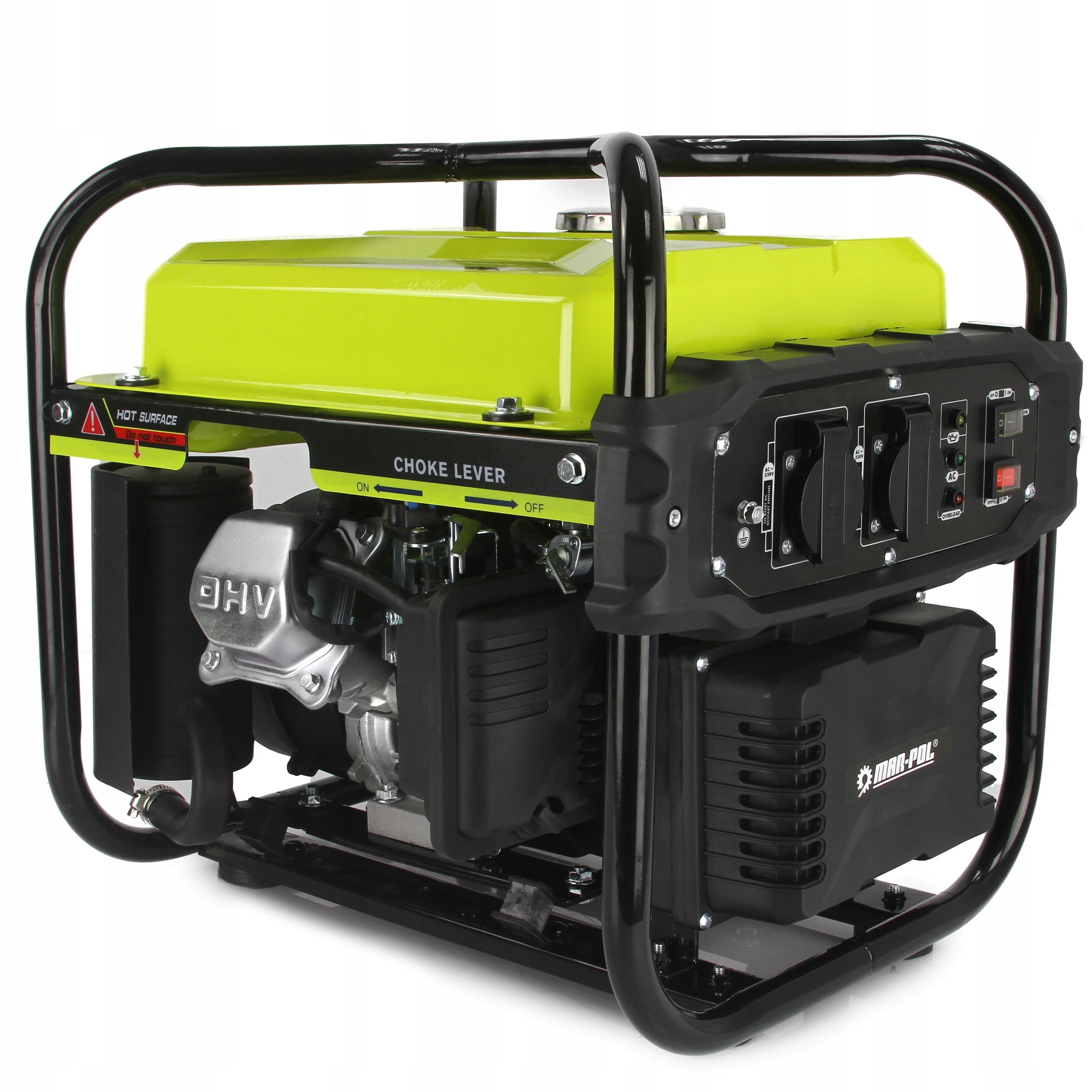 230V розетки з електронним захистом - після перевантаження або неконтрольованого коротке замикання, пропадає струм (перевірте, вимкніть і перезапустіть генератор, щоб у розетках з'явилася електрика)