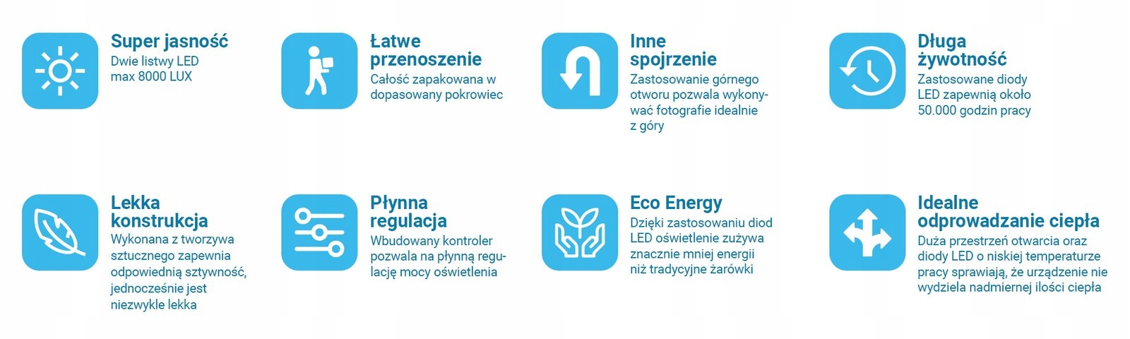 До 15 000 люкс, температура смуги 5500 K (+/- 200) і індекс передачі кольору CRI 92+ дозволять вам досягти природних і приємних для ока результатів. Сфотографовані вироби будуть добре освітлені, а кольори будуть правильно передані. Вбудований контролер дозволяє плавно регулювати потужність освітлення. Ви можете легко налаштувати відповідні параметри для отримання найкращих результатів.