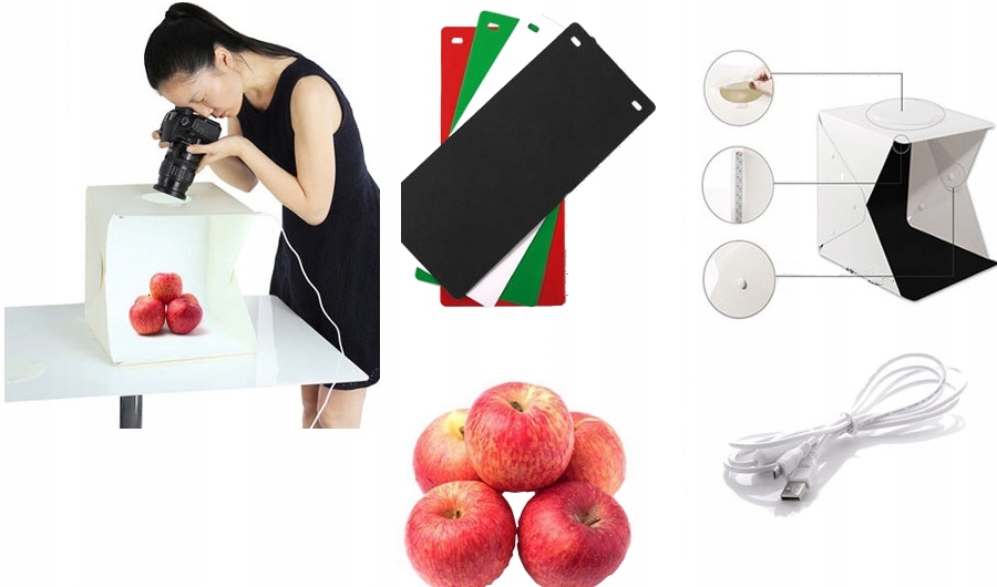 Швидке складання затискача дозволяє швидко налаштувати студію для фотозйомки продукту. Ідеальний набір для фотозйомки прикрас, косметики та інших невеликих предметів. Колірна температура 5500 К відбиває денне світло, і об'єкти, сфотографовані в ній, збережуть свої природні кольори. Світлодіодна стрічка живиться безпосередньо від порту micro USB, і намет готовий до використання без необхідності встановлення додаткових ламп. Весь набір упаковано в невеликий портативний футляр, який ми можемо розпакувати за кілька хвилин.