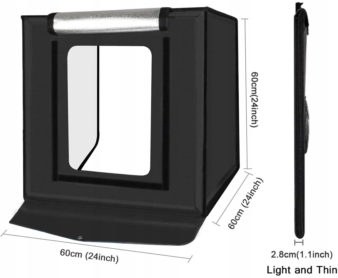 - Shotfoto YPS-60 професійний, складна кабіна для безтіньової фотозйомки зі стороною 40 см, оснащена світлодіодним освітленням, що дає природне освітлення, футляр/чохол, отвір у кришці для фотозйомки зверху, також є кольорові фони. Намет мобільний завдяки складній конструкції, а перевага такого набору в тому, що він дуже стійкий.
