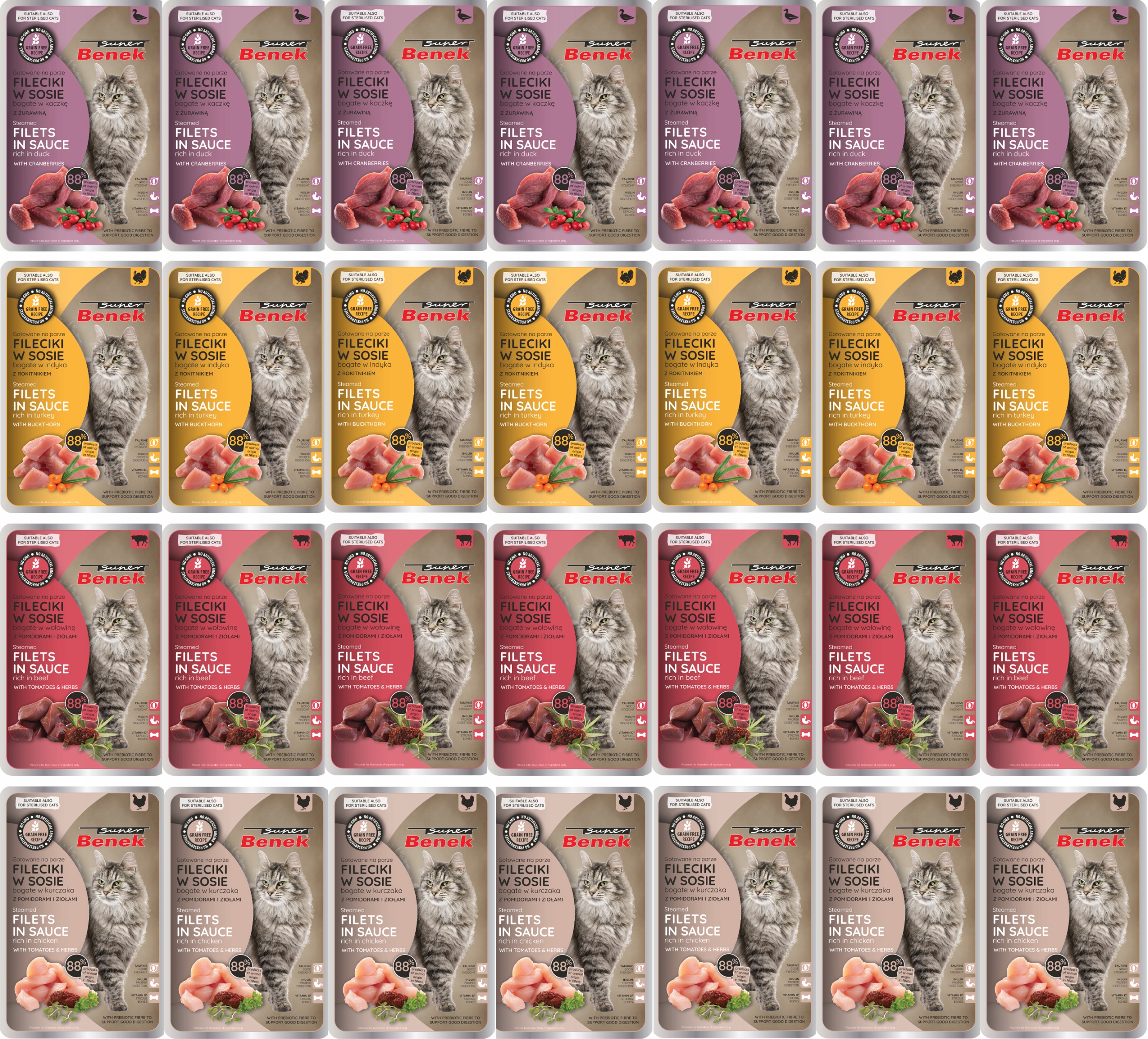 Пауси для котів Super Benek, філе на пару без зерна, МІКС смаків 28x85г