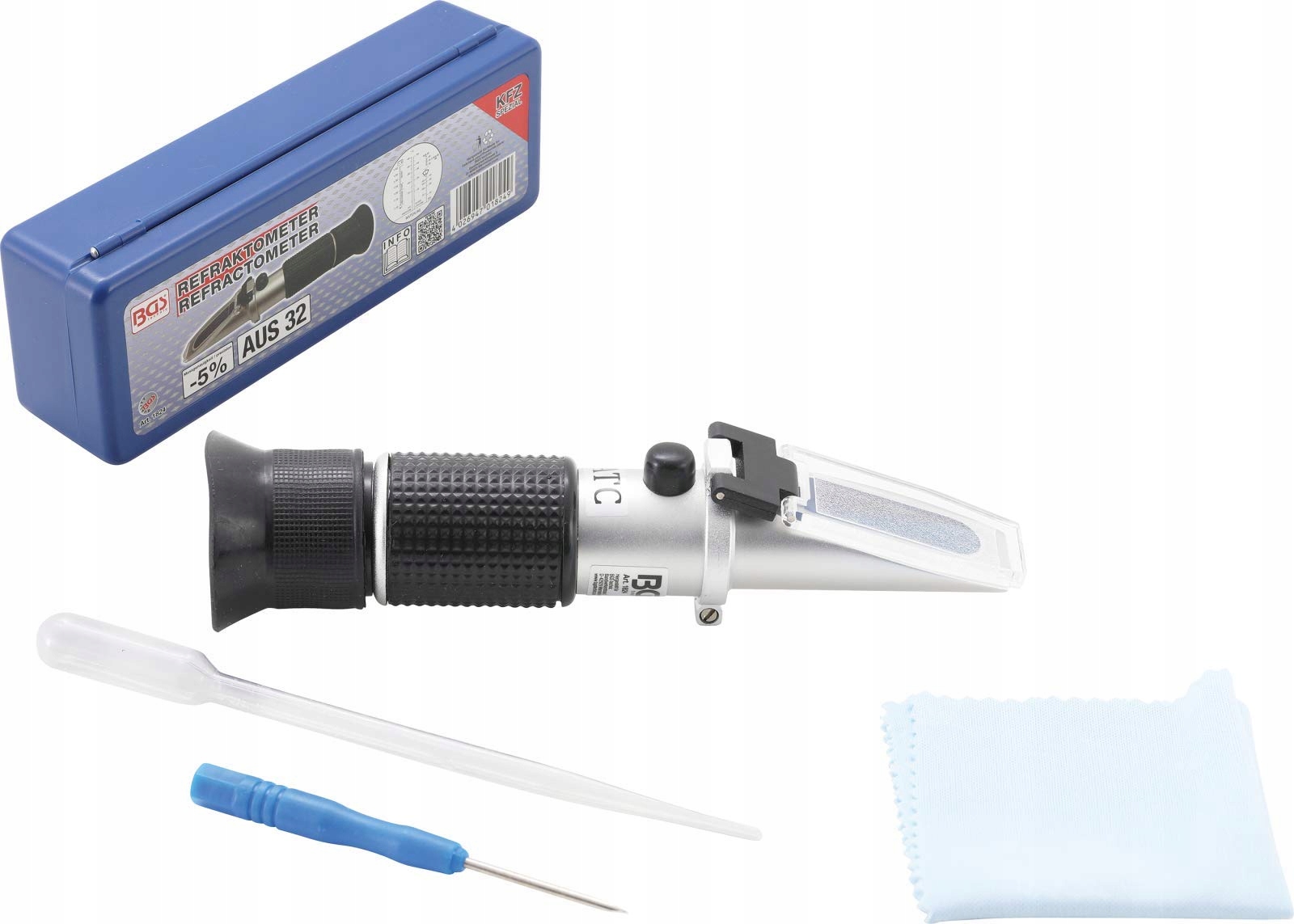 - Точка Позначка : Оптичний пристрій управління з різними функціями: Перевірка щільності електроліту: від 1,1 до 1,4 кг/л | Перевірка запобігання замерзання рідини охолодження (поділ на етилен та пропілен): від 0 ° до -50 ° C | Перевірка глазурі рідини шайби на основі етанолу та спирту (SRF1): від 0 ° до -40 ° C | Перевірка агента Adblue (AUS32), регульоване окуляри, точність вимірювання +/- 5 %, у вхідній скриньці вміст набору: рефрактометр | піпетка викрутка для регулювання Мікрофібриста тканина