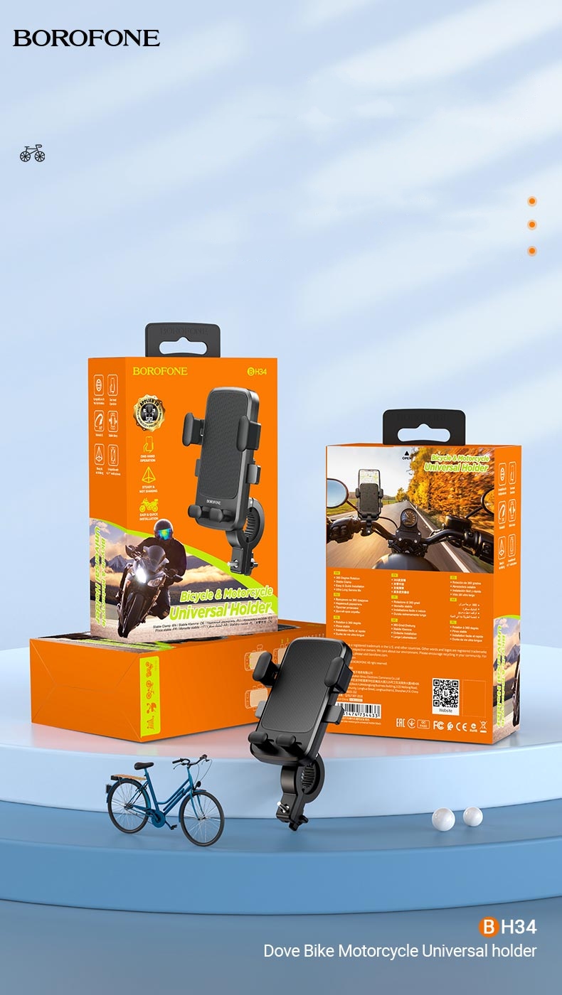 BOROFONE 34 Dove — міцний тримач для телефону, призначений для кріплення на раму велосипеда, скутер, скутер або мотоцикл/мотоцикл. Ручка також може бути встановлена на раму коляски, діапазон діаметрів рами повинен бути від 17 до 23 мм.