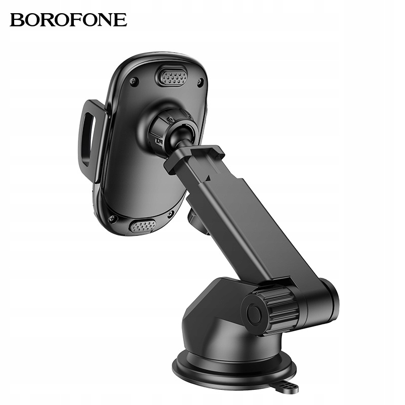BOROFONE BH53 Windyце автомобільний тримач для телефону, який підвищує безпеку водіння, оснащений присоскою чашка та регульований кронштейн, прикріплені до приладової панелі/консолі автомобіля або борту/лобового скла автомобіля за допомогою силіконової присоски з клеєм, з матовою структурою та елементами, схожими на вуглецеве волокно. Тримач має ручні ручки та регульовані ніжки.