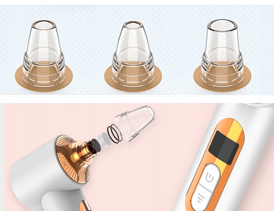 - Чотири типи присмоктувачів для різних застосувань: A) Маленький круглий наконечник для тонких і делікатних ділянок; B) Великий круглий наконечник для видалення чорних крапок з більшою силою; C) Овальний кінчик зменшує тонкі зморшки та підвищує еластичність шкіри.