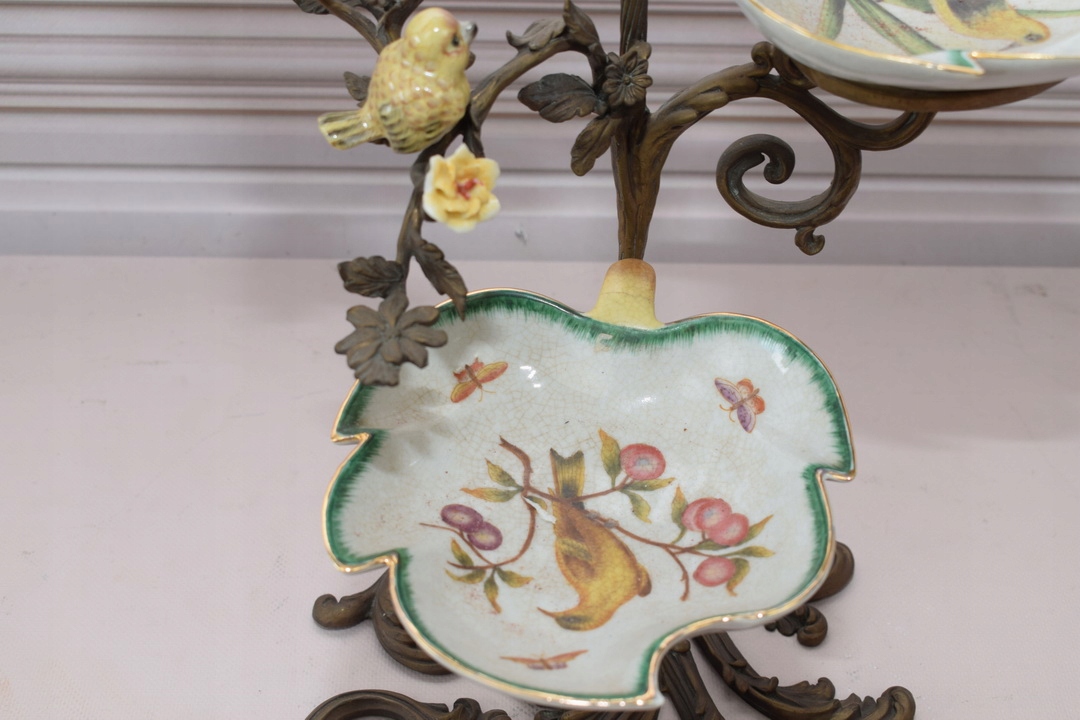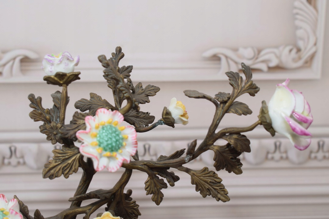Biała Porcelanowa Patera - Okuta Brązem Brąz - Kolorowe Kwiaty Ptaki