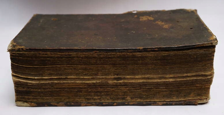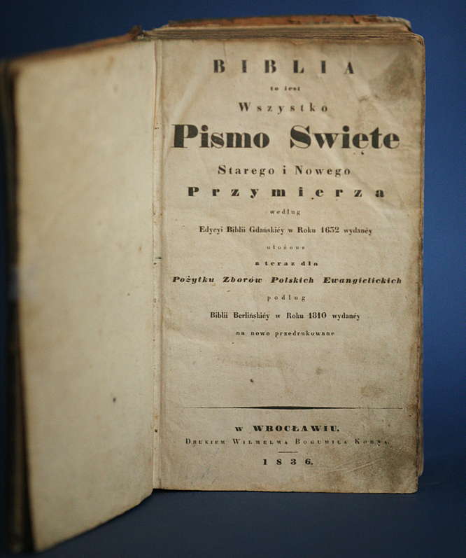 Вроцлавське видання всього Святого Письма, як Старого, так і Нового Заповіту, надруковане Вільгельмом Корном. Шкіряна палітурка (потертості, дефекти, старі печатки власності на форзаці), арк.973+316. Хороший загальний стан - (брудні/знебарвлені картки)