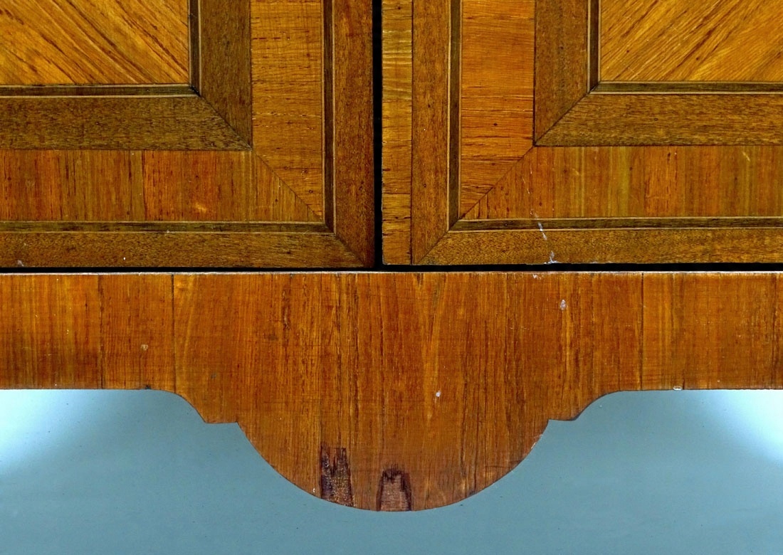 з простою конструкцією, закритою парою скляних дверей, що спираються на чотири ніжки, передні м’яко вигнуті, задні кутасті. Дверні полотна знизу оздоблені фільонкою, розміщеною в резерві, зі шпоном, розташованим під кутом і оточеним двома тонкими дерев’яними прожилками. У правій стулці сталевий замок на засувку з ключем, у лівій стулці сталеве вушко для з'єднання із засувкою від середньої полиці для їх закриття, зовні - ключ. Передні кути обрізані, прикрашені латунними аплікаціями, як і передні ніжки. Стільниця виконана з травертину, бічні частини меблів суцільні з шпоном, розташованим як на нижніх панелях. Всередині три полиці, розташовані на планках із гребінцем, що дозволяє їх вільно розміщувати.