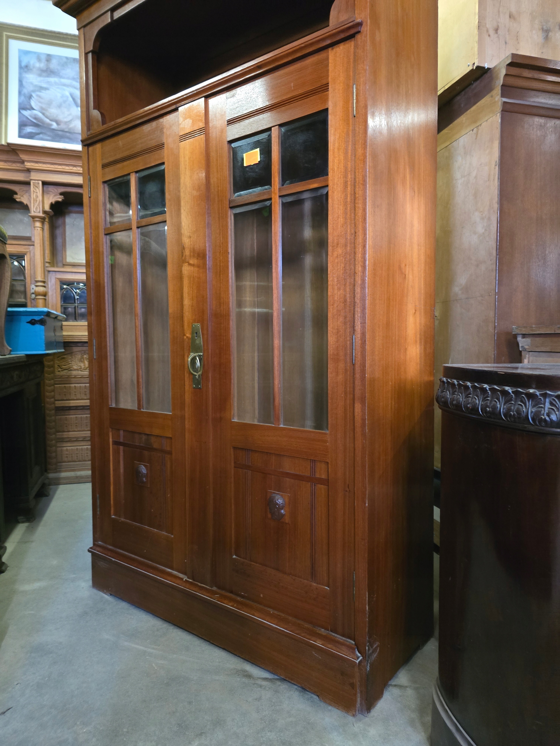 Бібліотека з волоського горіха в стилі модерн із головами на панелях, приблизно 1900 рік.