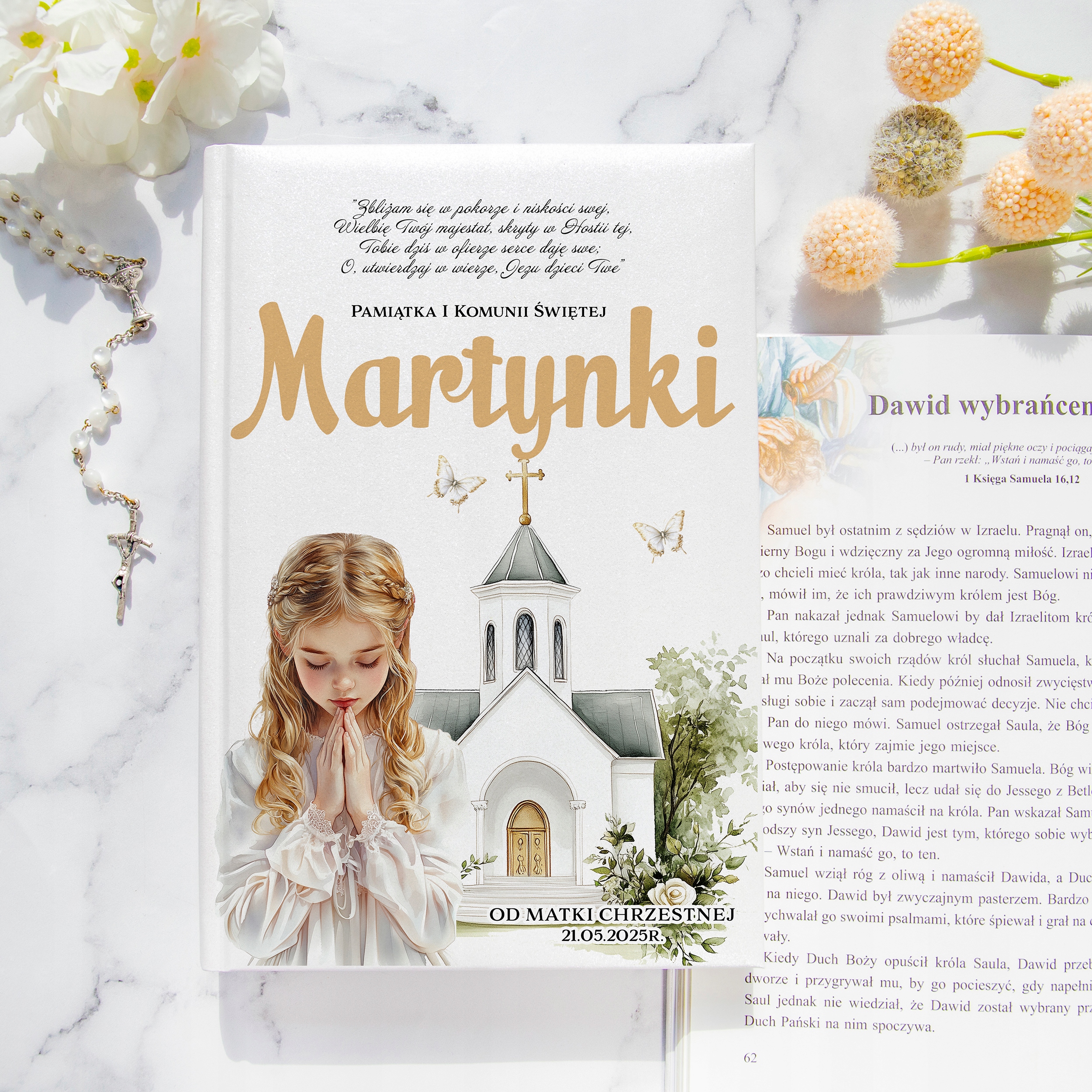 На обкладинці Біблії існує цитата, а персоналізація доступна для дати причастя та обраного імені дитини. Остання техніка цифрового УФ -друку дозволяє зберігати надзвичайно яскраві, виразні кольори, які не згасають. Найвища якість. Найкращий подарунок/сувенір для Святого Причастя.