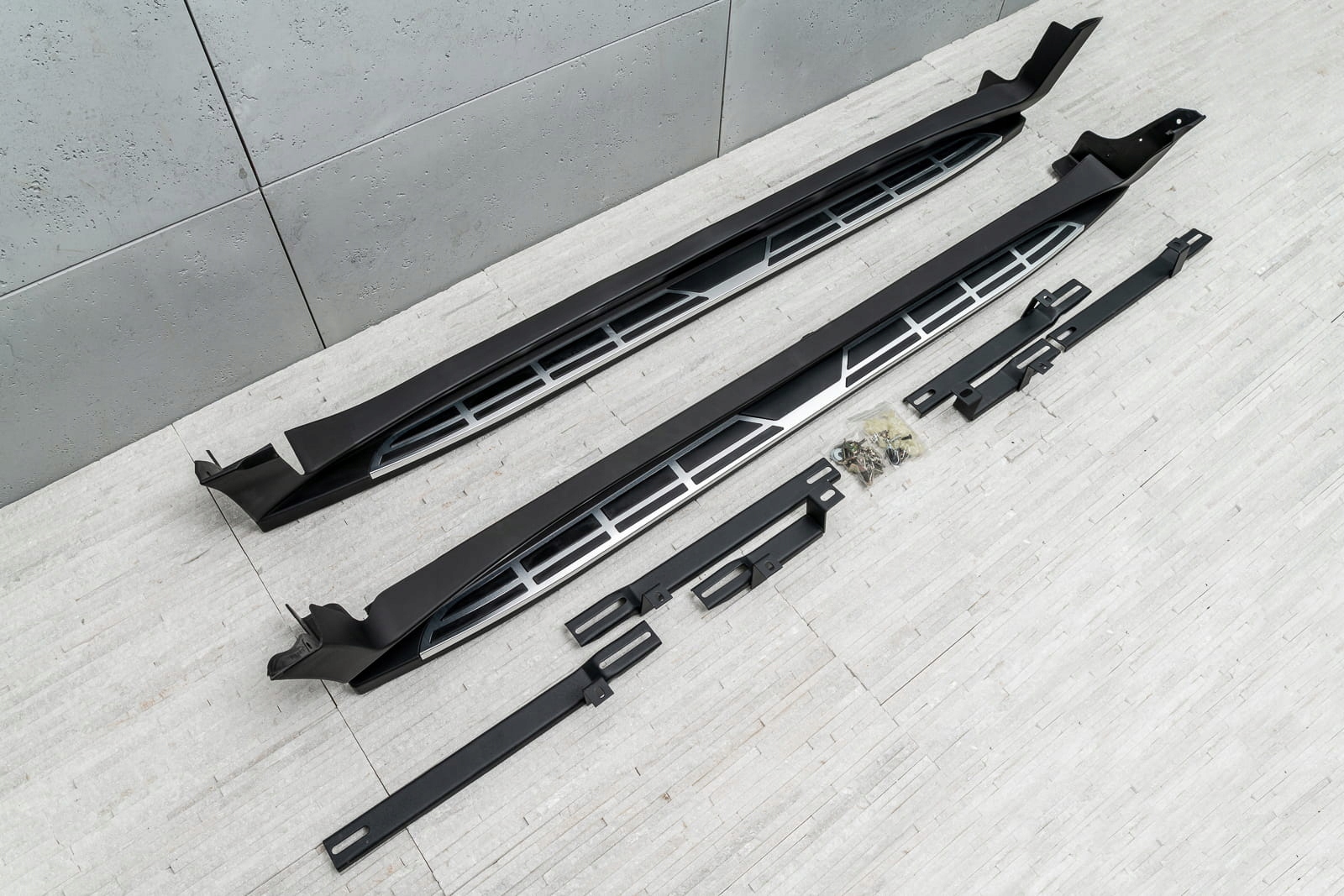 Представляємо набір порогів, які відрізняються оригінальним сучасним дизайном. Пороги розроблені відповідно до сучасних тенденцій, тому вони не тільки підвищують комфорт подорожуючих, але й є справжньою окрасою автомобіля. Декоративні сталеві елементи додають престижний акцент на порогах, а також відсилають до інших елементів кузова вашого автомобіля - все це означає, що пороги ідеально доповнюють стиль автомобіля, підкреслюючи його спортивну душу та індивідуальний характер.