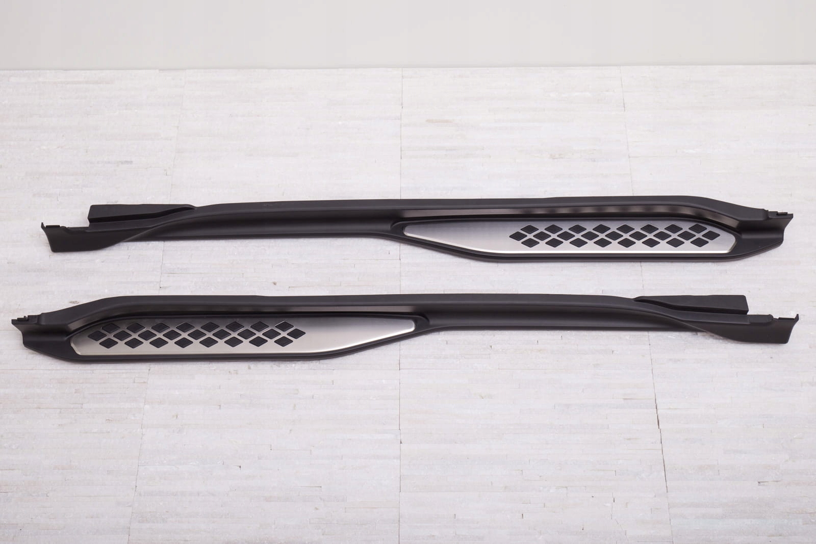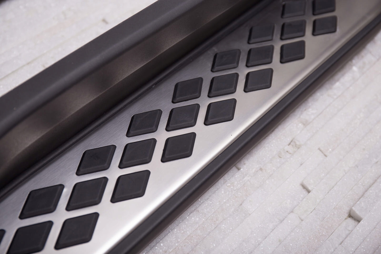 Виріб виготовлено з високоякісного алюмінію та автомобільного пластику ABS. Декоративні елементи на поверхні порогів виготовлені з високоякісної нержавіючої сталі. Вантажопідйомність на сторону 160 кг.