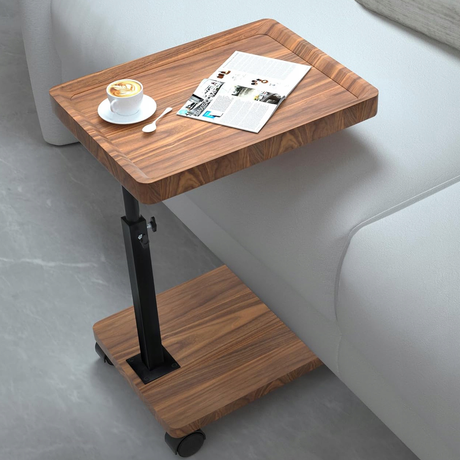 Форма букви C дозволяє легко вставити стіл на колеса під диван або ліжко. Цей бічний стіл С, оснащений великою полицею верхньої та нижньої полиці, пропонує багато місця для зберігання найбільш необхідних речей та допомагає зберегти порядок.