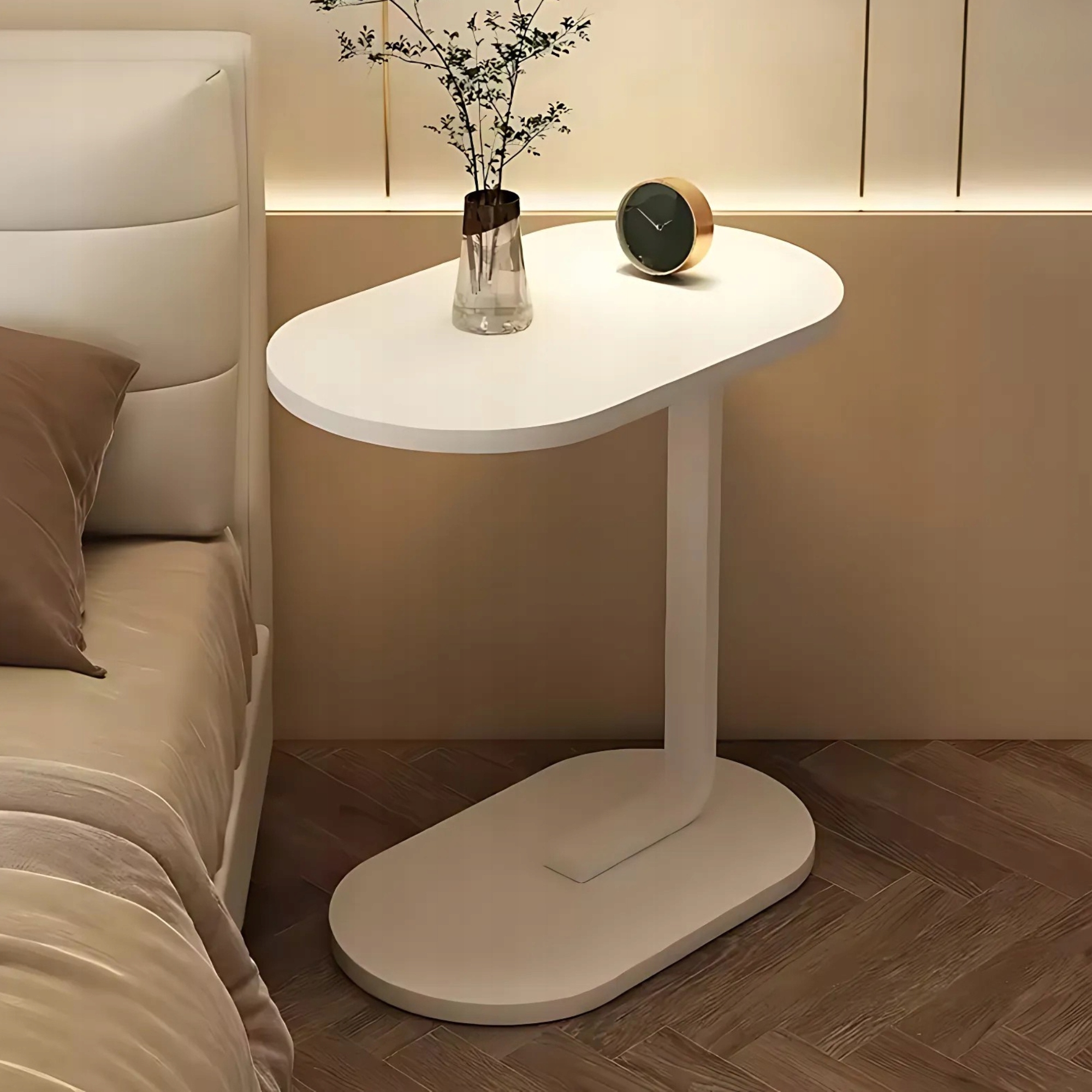 ☑ Елегантний і практичний бічний стіл, , який буде ідеальним у вітальні, спальні чи офісі. Завдяки ергономічній формі його можна поставити під диван або ліжко, яке економить місце. Стильна біла обробка надає йому сучасний вигляд і відповідає різним умовах інтер’єру.