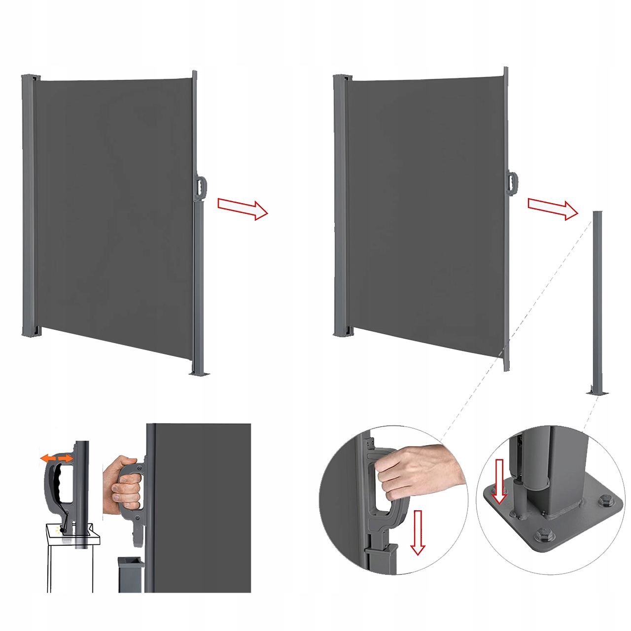 Наш бічний тент має систему автоматичного згортання. Просто натисніть кнопку розблокування на ручці, і рулонна штора автоматично втягнеться в касету. Це так просто!