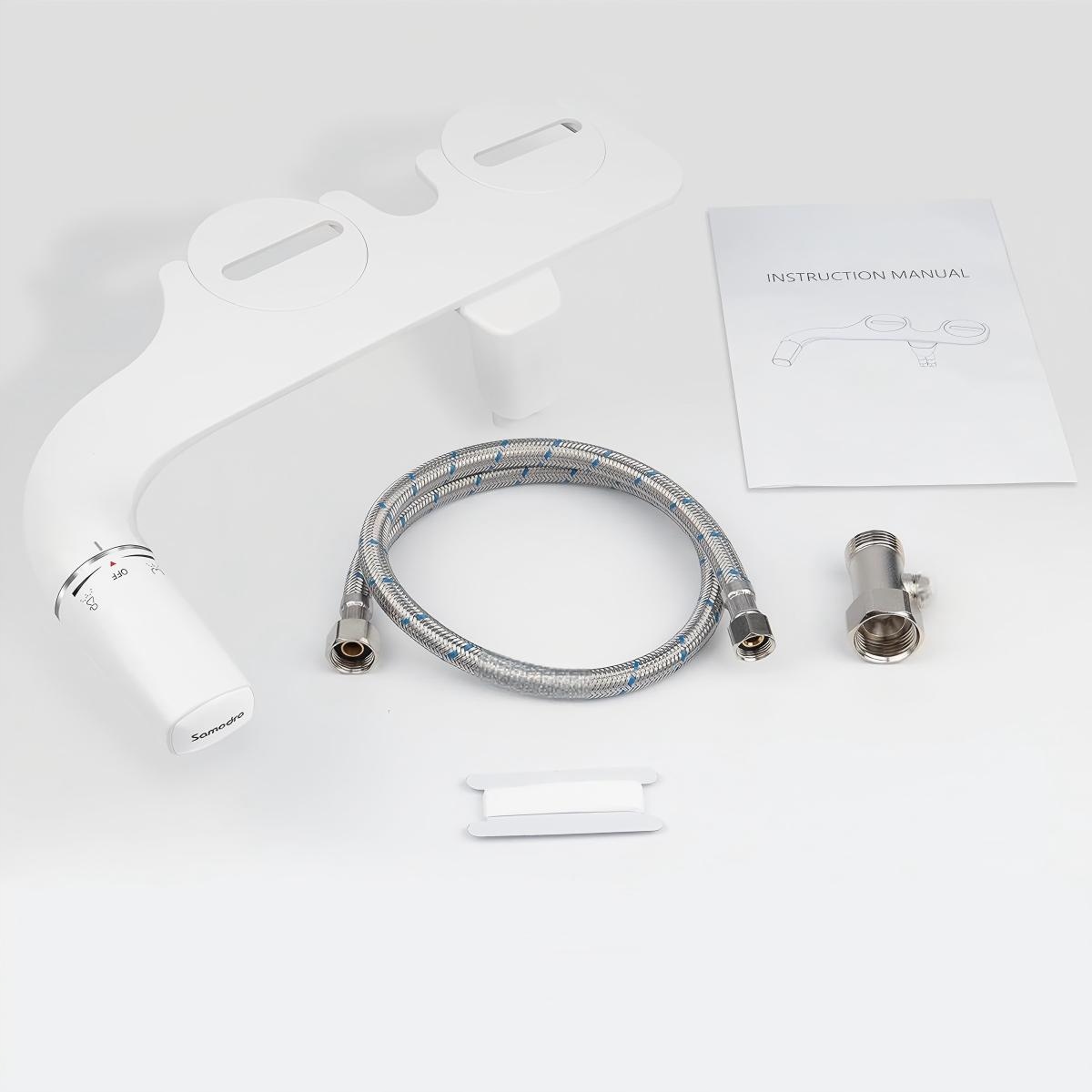 Біде постачається з T-подібним адаптером G3/8" і шлангом із нержавіючої сталі довжиною 80 см. Поради: якщо шланг закороткий, ви можете замовити шланг G3/8" (внутрішня різьба: 3/8 дюйма - зовнішня різьба з одного боку: 3/8 дюйма) за у магазині товарів для дому або на eBay/Amazon і під’єднайте його до наданого шланга. (1 метр/1,5 метри/2 метри) доступні окремо.