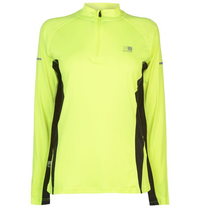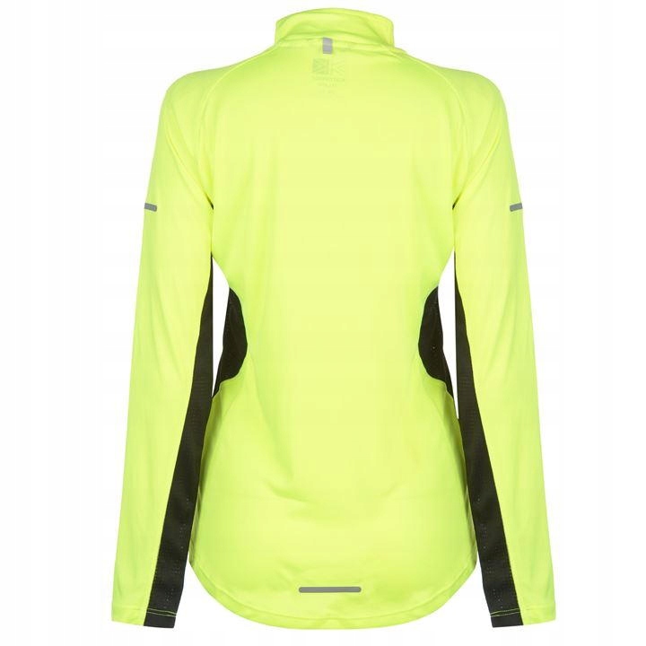 Спортивна футболка з довгими рукавами RUN Karrimor Tee. Комір-стійка. Футболка застібається на блискавку 1/4 на горловині та закінчується підборіддям, що запобігає подряпинам. Повітряна тканина (сітчасті панелі) використовується під пахвами для підвищення комфорту та свободи під час тренувань. Панелі контрастного чорного кольору. Для підвищення безпеки під час використання на футболці є світловідбивачі. Спинка трохи довша за перед. Легкий матеріал, з якого він виготовлений, має дихаючі властивості та швидко сохне. Футболка має плоскі шви і рекомендована для всіх видів спорту. Підписано логотипом компанії.