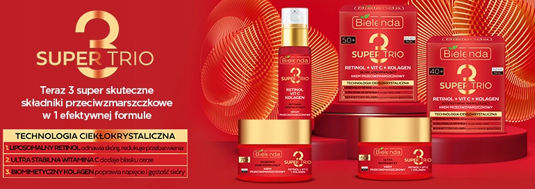 Поєднання трьох мегаефективних інгредієнтів із підтвердженою дією: РЕТИНОЛ, ВІТАМІН С і КОЛАГЕН, занурене в технологічно передові рідкокристалічні формули, створює СУПЕР ТРІО, яке здатне максимально зменшити ознаки старіння, видимі на обличчі. шкіра.