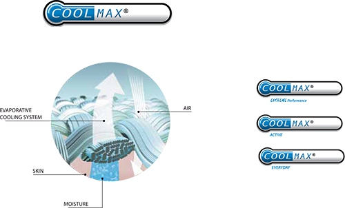 CoolMax - це технологічно розвинене поліефірне волокно, призначене головним чином для виробництва термоактивної нижньої білизни. Його чотириканальна конструкція - запатентована Du Pont - забезпечує чудові властивості, такі як: дренаж поту та випаровування та відмінна дихання.