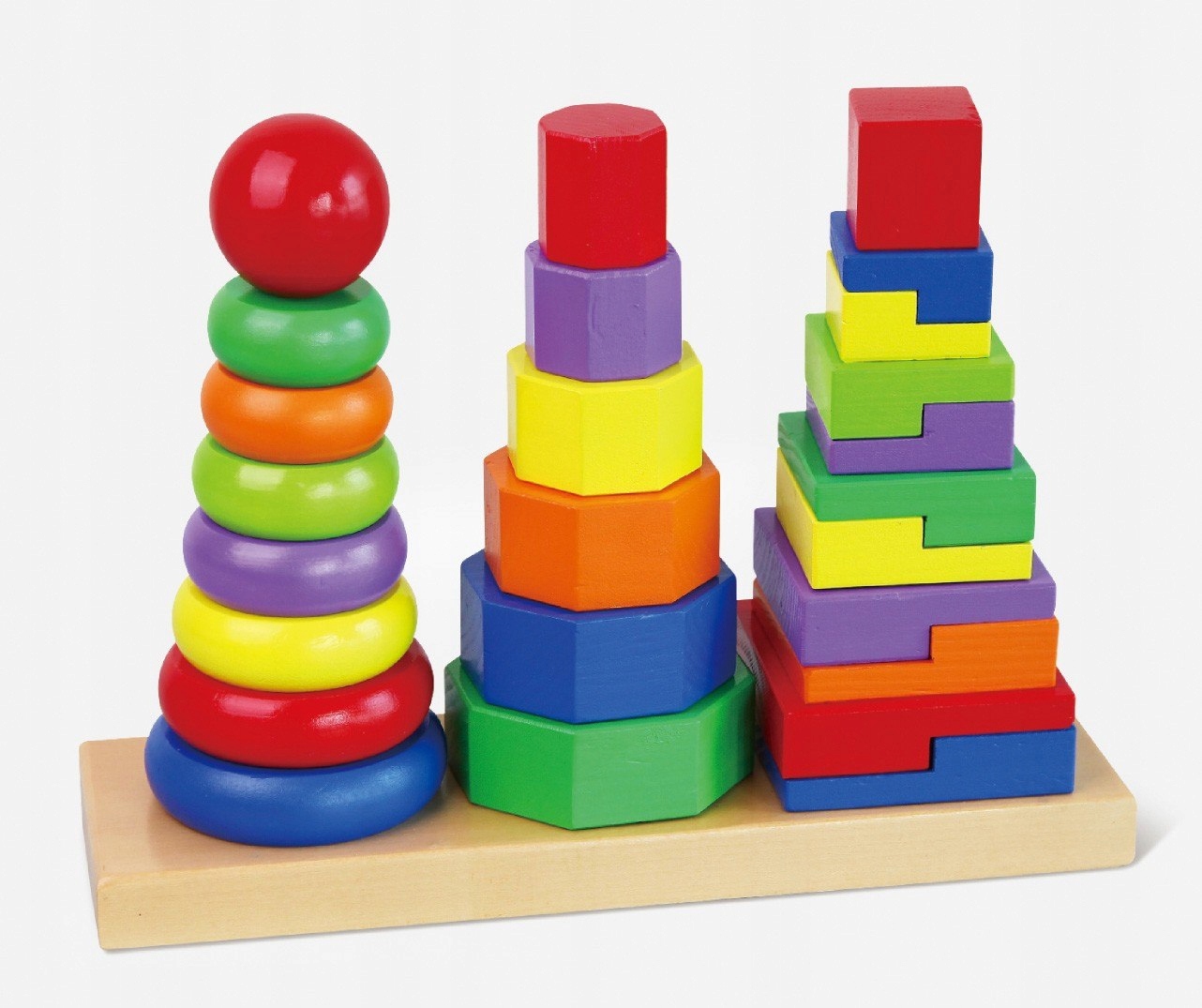 - містить 3 піраміди , які розміщуються на дерев’яній основі. Дитина повинна застосувати правильну форму до потрібного місця та в правильному порядку для створення вежі. Кожен з них має різні геометричні фігури, завдяки яким дитина не буде нудно занадто швидко. Фарби, які ми малюємо наші іграшки, не були токсичними та відповідали стандартам безпеки (EN71 та ASTM).
