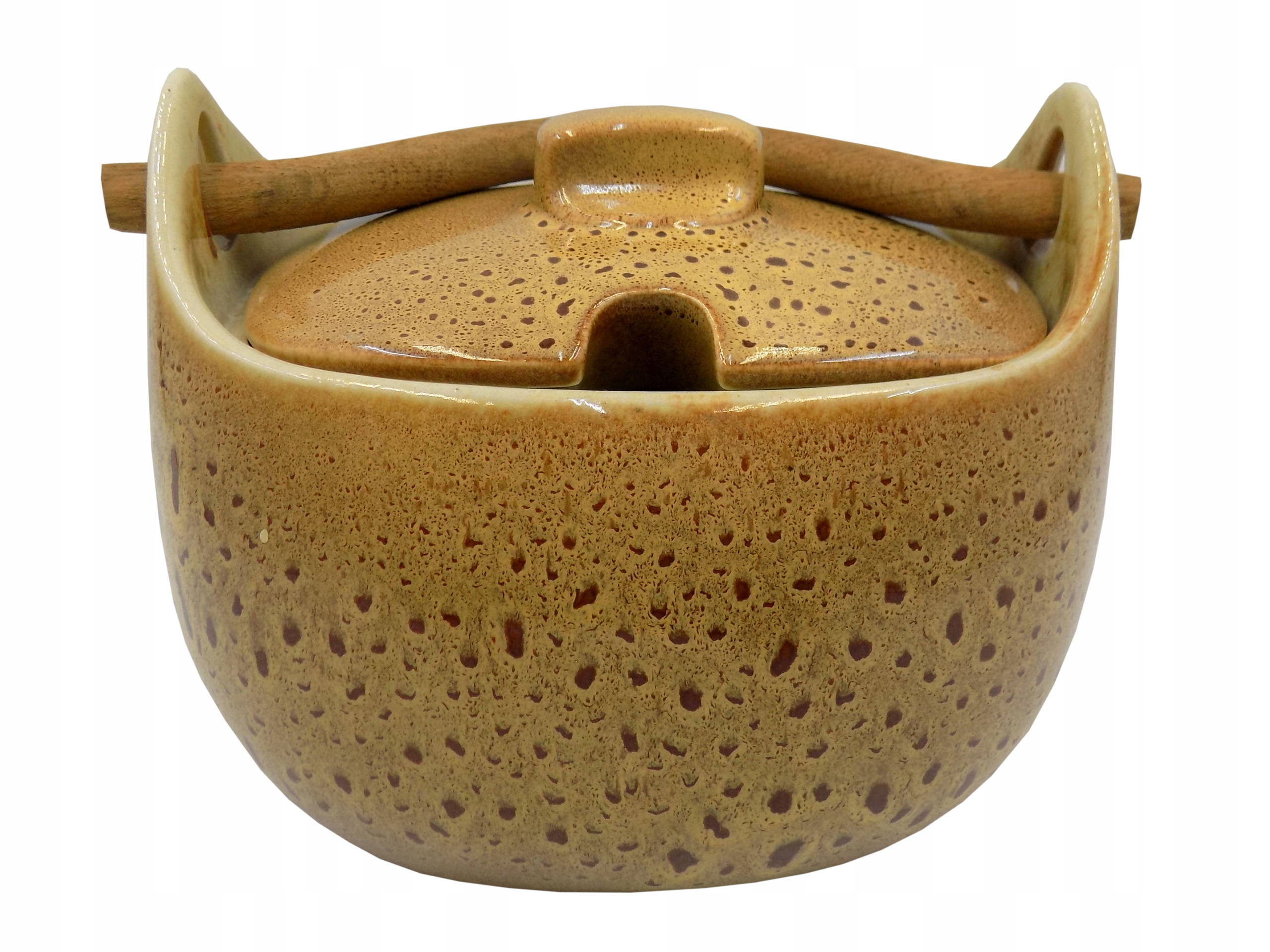 Керамічний контейнер із кришкою та дерев’яною ручкою з унікальною глазур’ю з Міростовіце Дольне. Розміри; висота 17 х 24 х 18 см. Ємність 2 л.