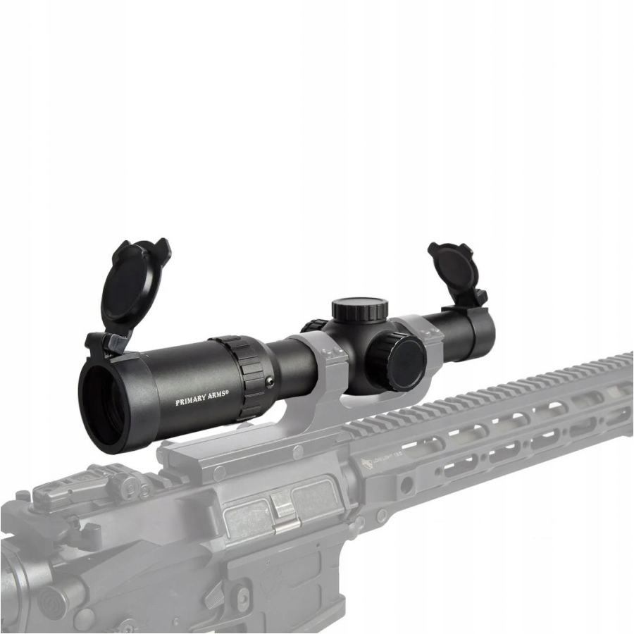 - Приціл Primary Arms SLx 1-8 × 24 мм SFP має підсвічену сітку на передньому плані. Прицільна сітка типу BDC з підсвічуванням ACSS 5.56/5.45/.308 використовувалася на задньому плані, зберігаючи свій розмір незалежно від зміни збільшення.