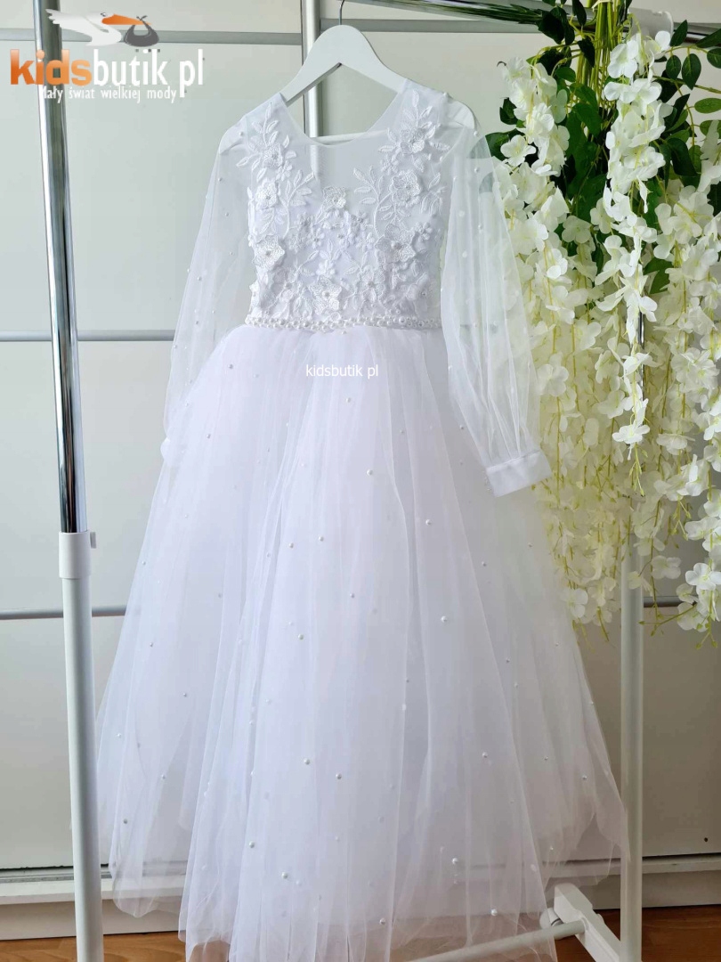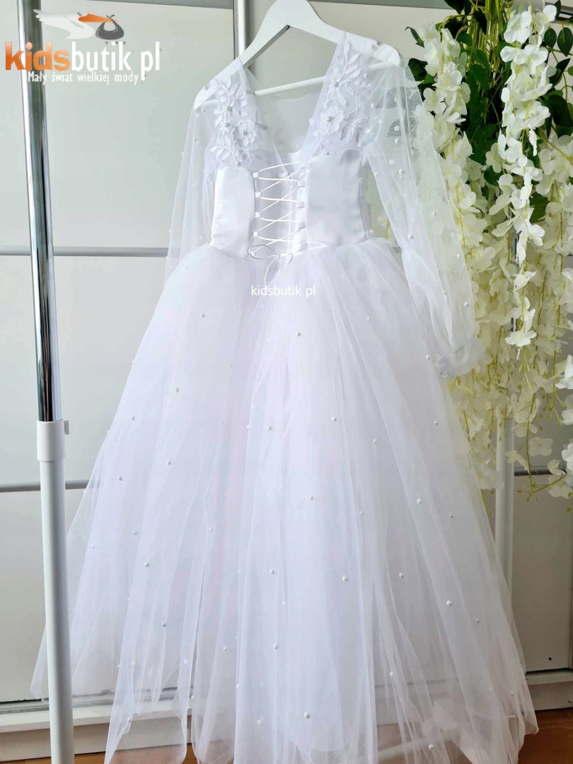 Красива довга біла сукня для церемонії Першого Святого Причастя. Все прикрашене перлами. У верхній частині є ефектне мереживо з квітковим мотивом. Низ виконаний з декількох шарів фатину, в тому числі з одного жорсткого, завдяки чому сукня ідеально сидить без каблучка або під'юбника. На спині застібка на повну довжину і зав'язка, яка дозволяє регулювати ширину грудей і талії приблизно на 15 см. На рукавах декоративна застібка на гудзики.