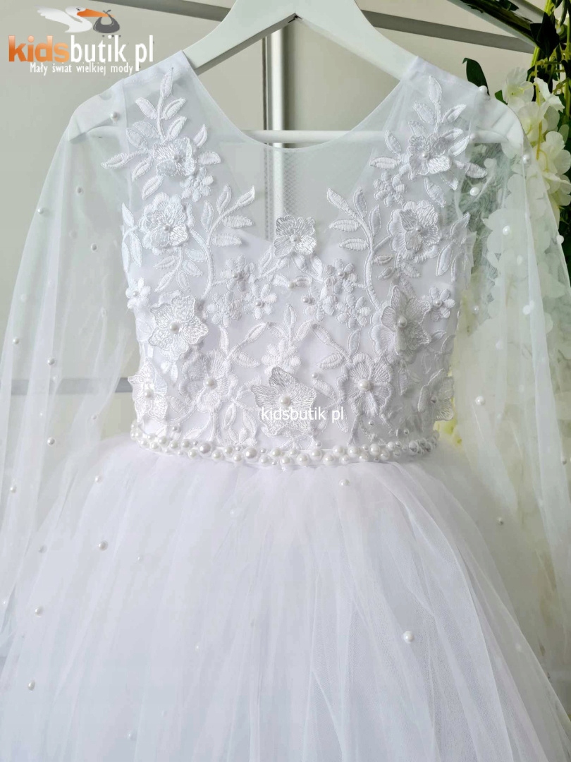 Красива довга біла сукня для церемонії Першого Святого Причастя. Все прикрашене перлами. У верхній частині є ефектне мереживо з квітковим мотивом. Низ виконаний з декількох шарів фатину, в тому числі з одного жорсткого, завдяки чому сукня ідеально сидить без каблучків і під'юбника. На спині застібка на повну довжину і зав'язка, яка дозволяє регулювати ширину грудей і талії приблизно на 15 см. На рукавах декоративна застібка на гудзики.