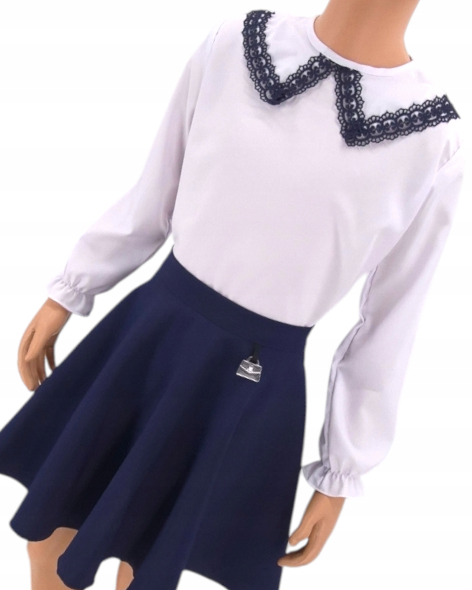 елегантна блузка з ніжним темно -синім мереживом під шиєю ідеально вписується з гала -спідницею, ідеально підходить для початку та кінця навчального року, а також закликів до шкіл та інших важливих подій. Її унікальний дівочий персонаж привертає увагу своєю чарівністю.