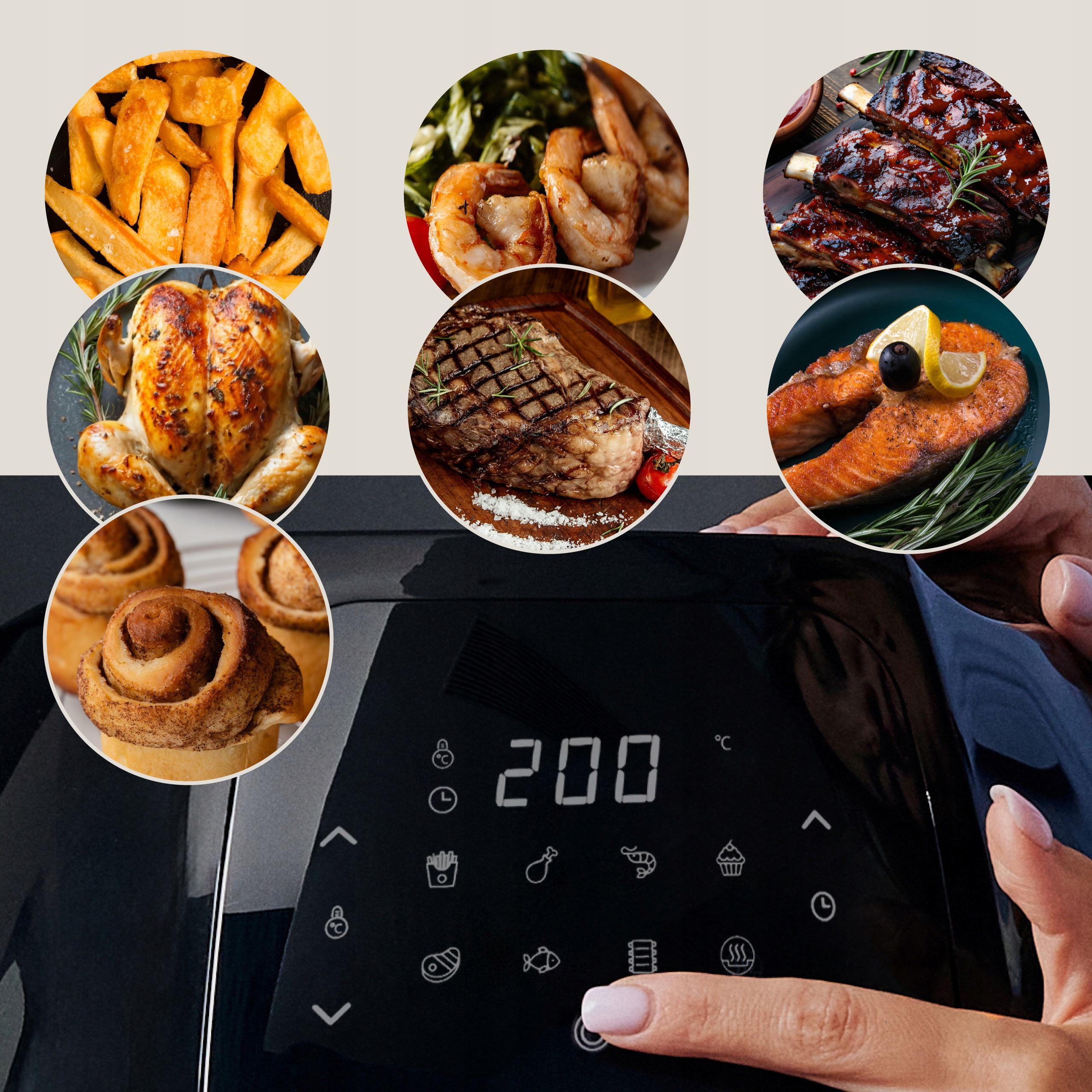 - 9 програм приготування: картопля фрі, курка, креветки, торт, стейк, риба, ребра, попередній нагрів, ручний