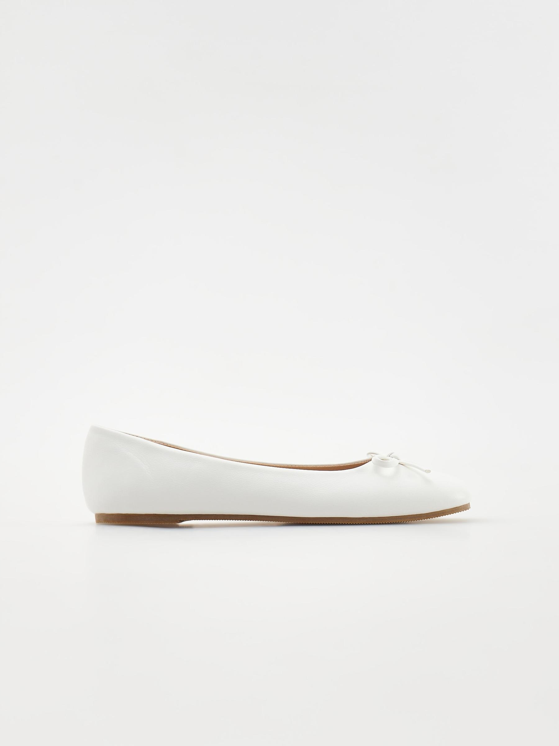 Біла гладка еко -шкіряна плоскі взуття ковзання -в балеринах з луком 31