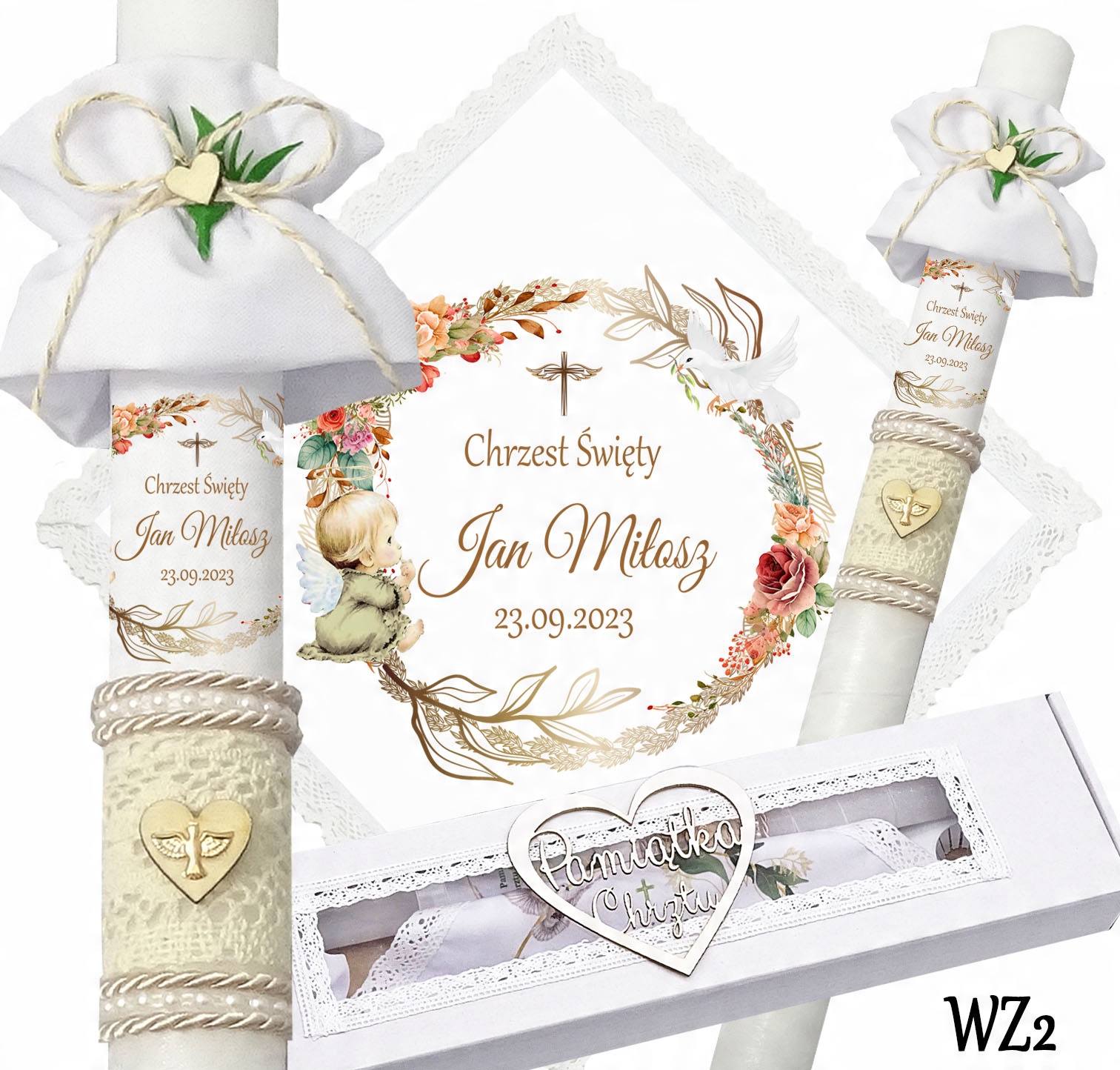 Наша пропозиція також включає пластикову капелюшок, яку ви можете придбати на нашому іншому аукціоні. Крім того, ми також пропонуємо подяки гостям, бабусям і дідусям, хресним батькам, а також інші аксесуари, необхідні для церемонії хрещення.