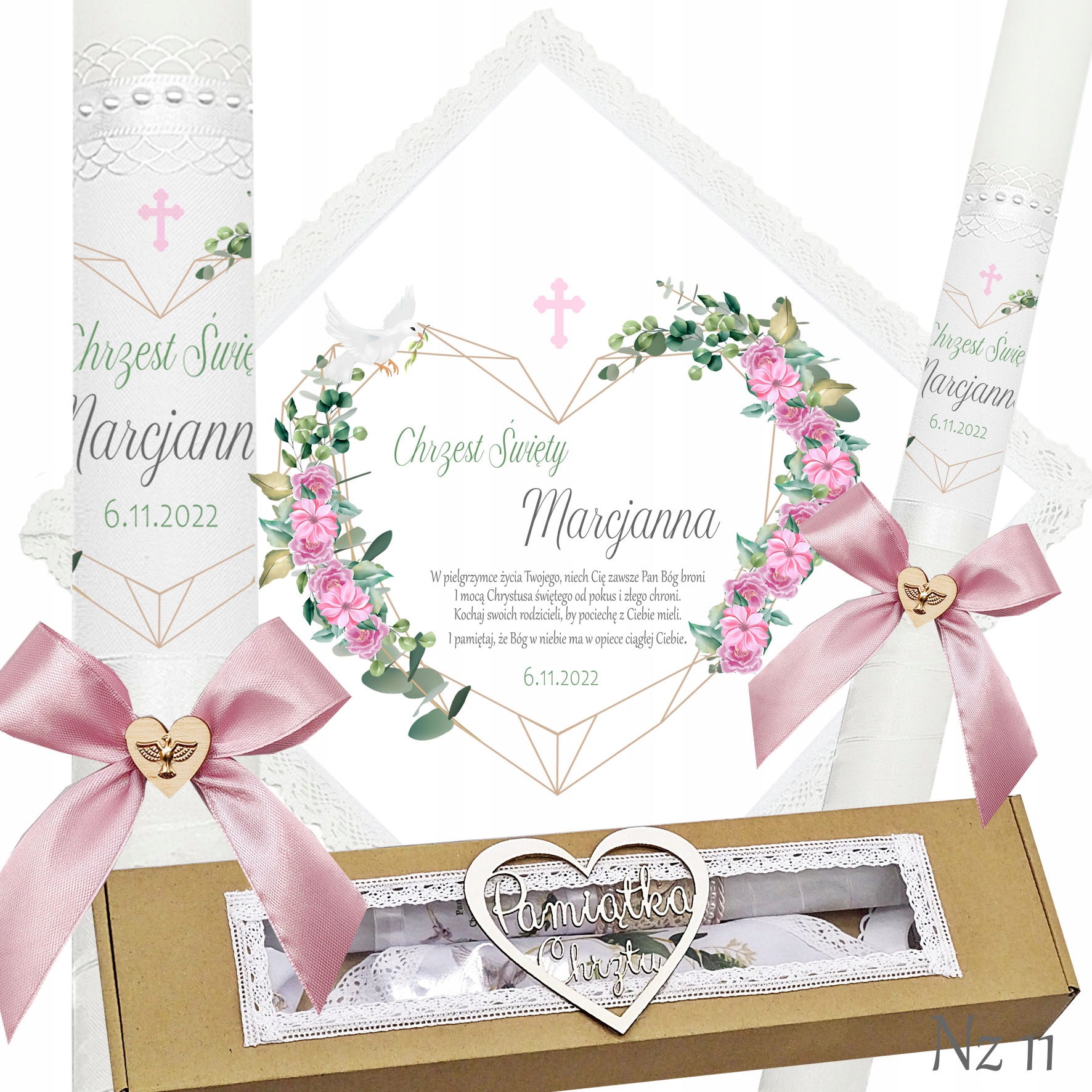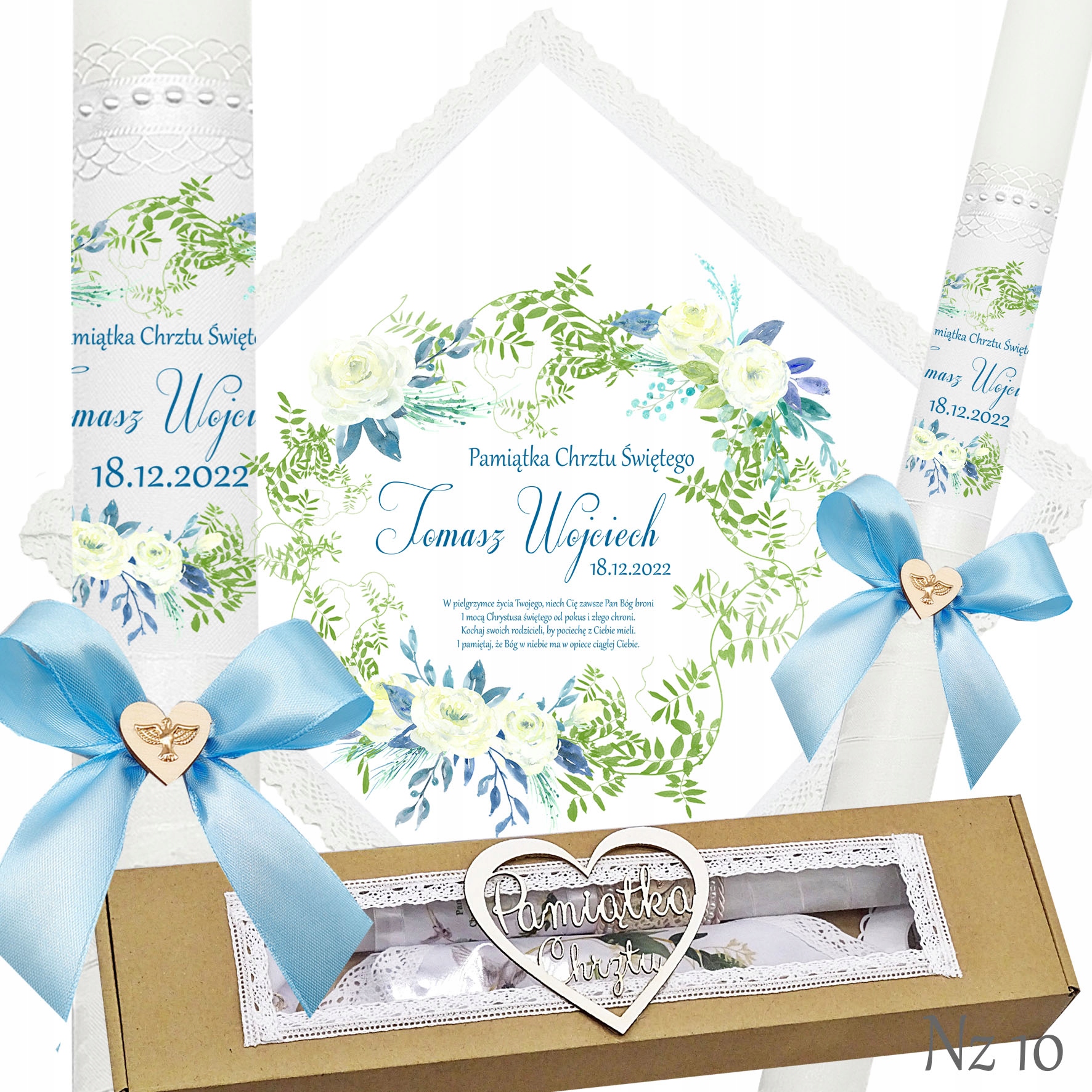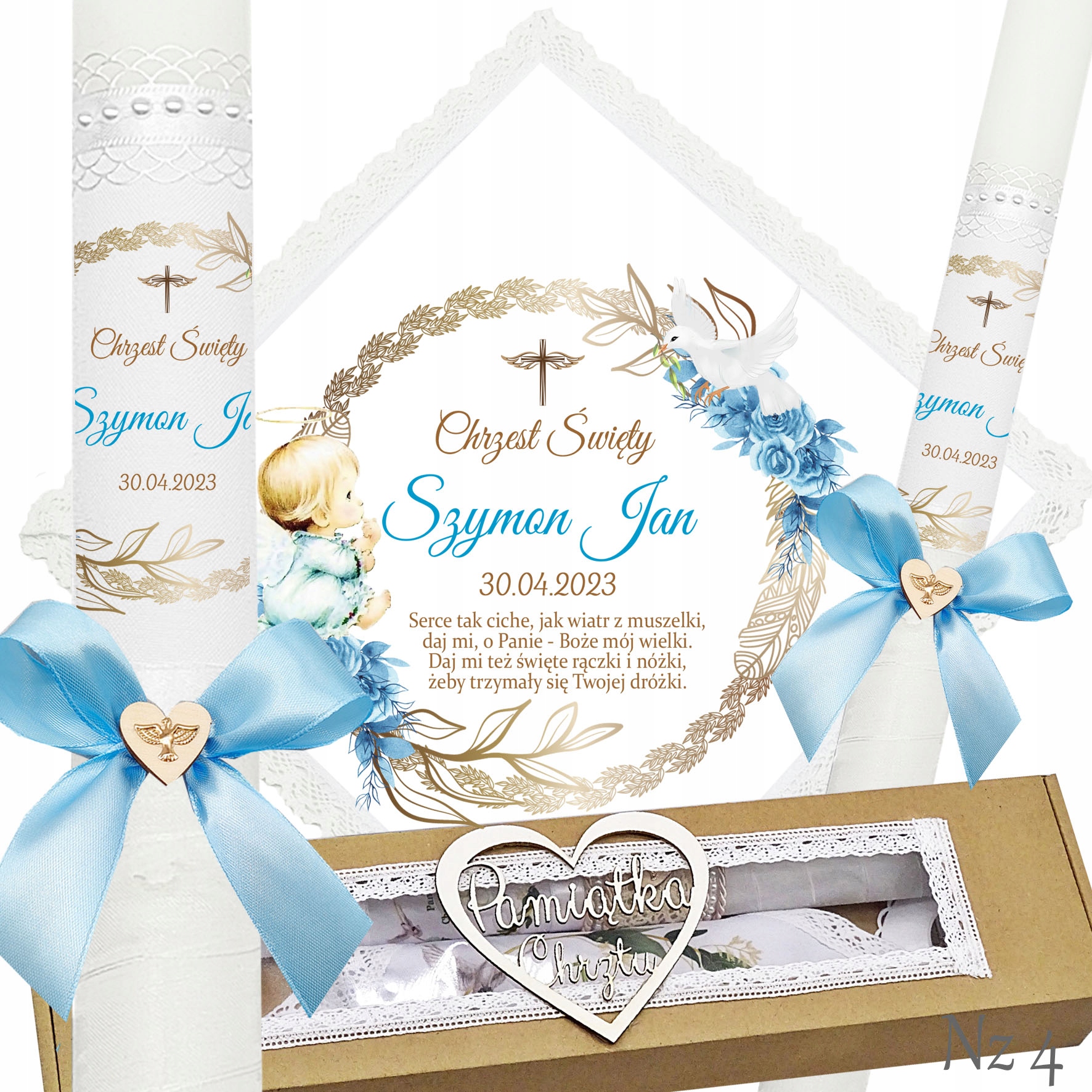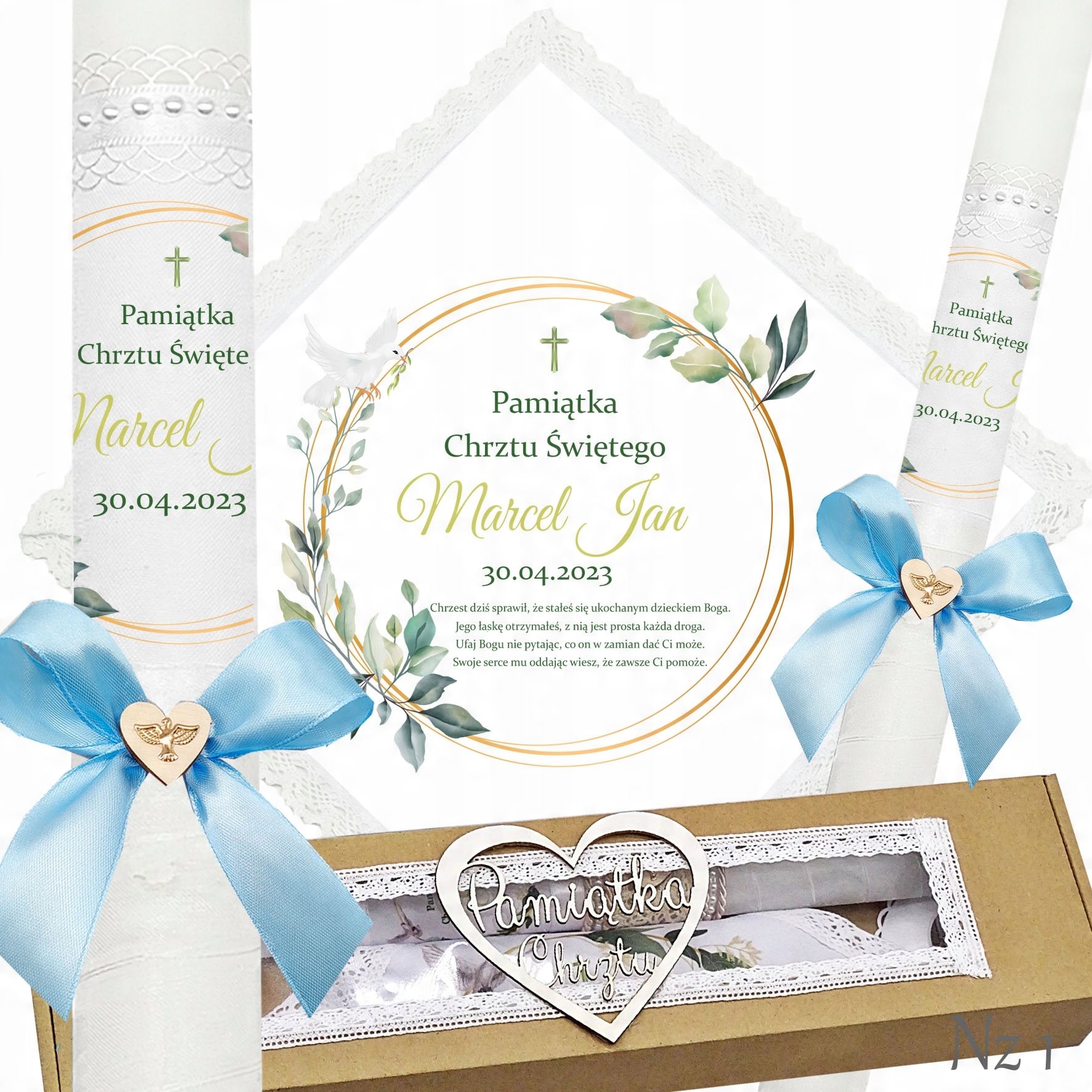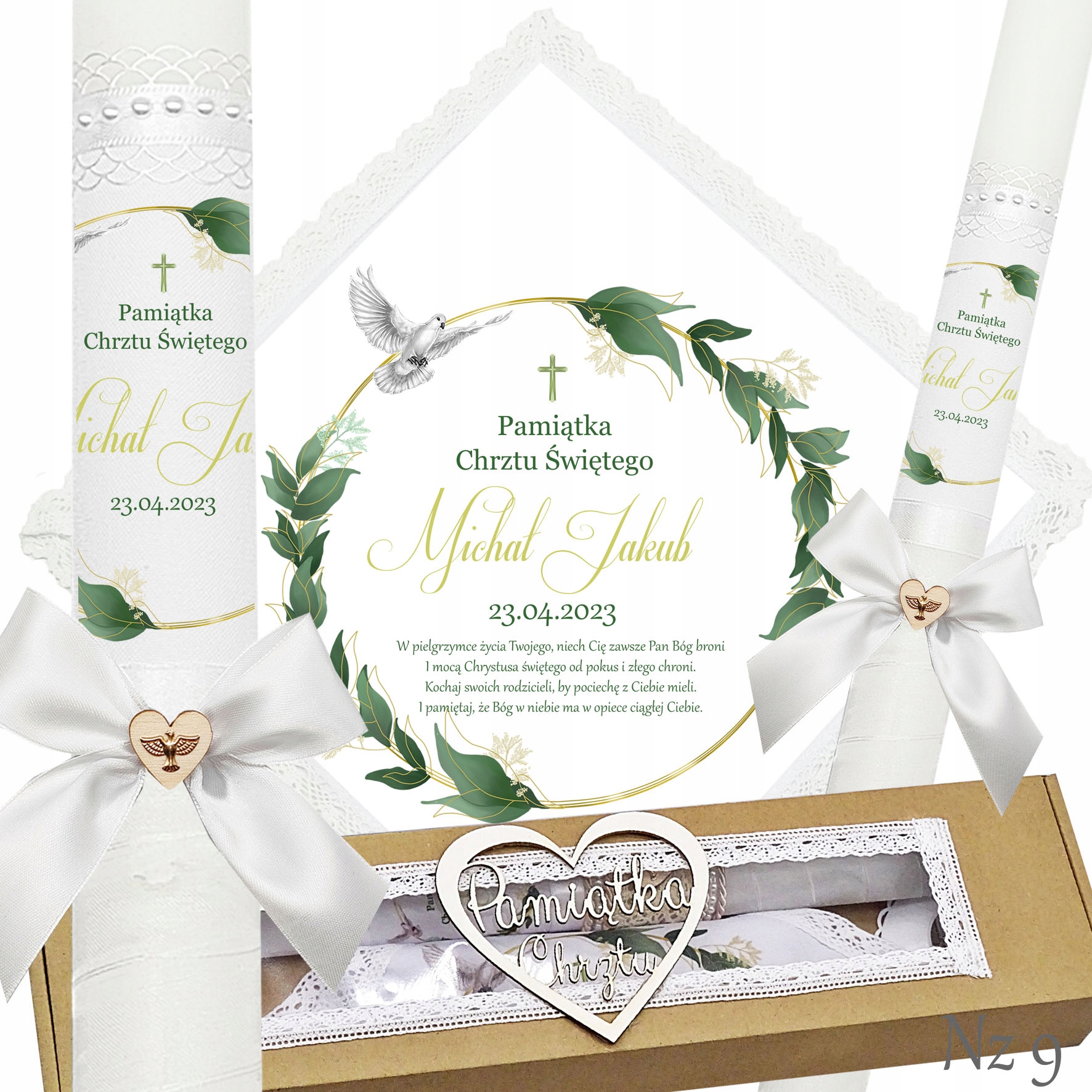 Представляємо надзвичайний набір для хрещення, що складається з ризи та свічки, ідеальний вибір для батьків які хочуть відсвяткувати цей особливий день елегантно та незабутньо. Свічка прикрашена білою шифоновою стрічкою, що додає їй неповторний характер і шарм. Верх свічки прикрашений атласним мереживом і білими перлами, що надає їй елегантності та шику. Лук з дерев'яним серцем і металевою золотою емблемою Святого Духа. додає чарівний і сентиментальний акцент.