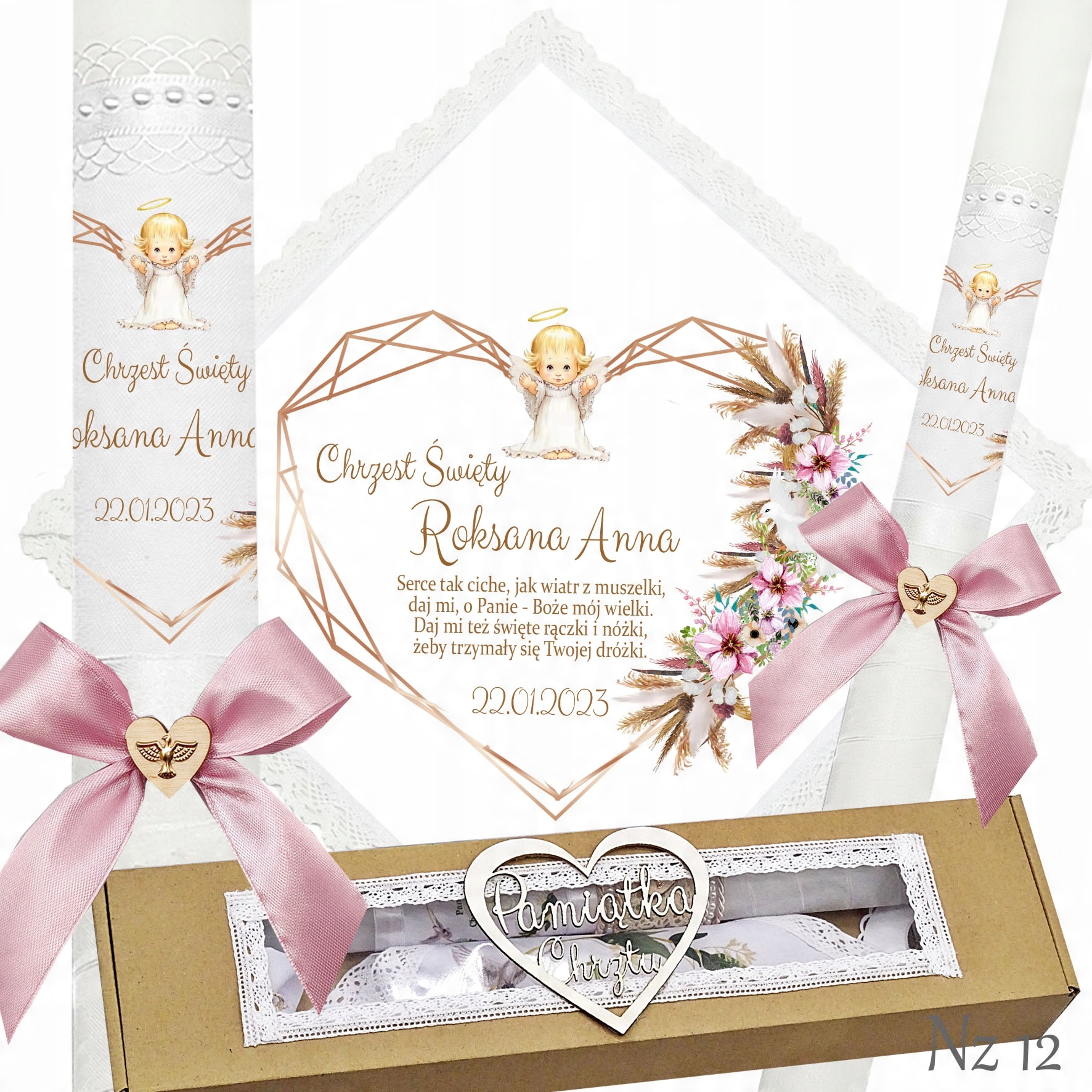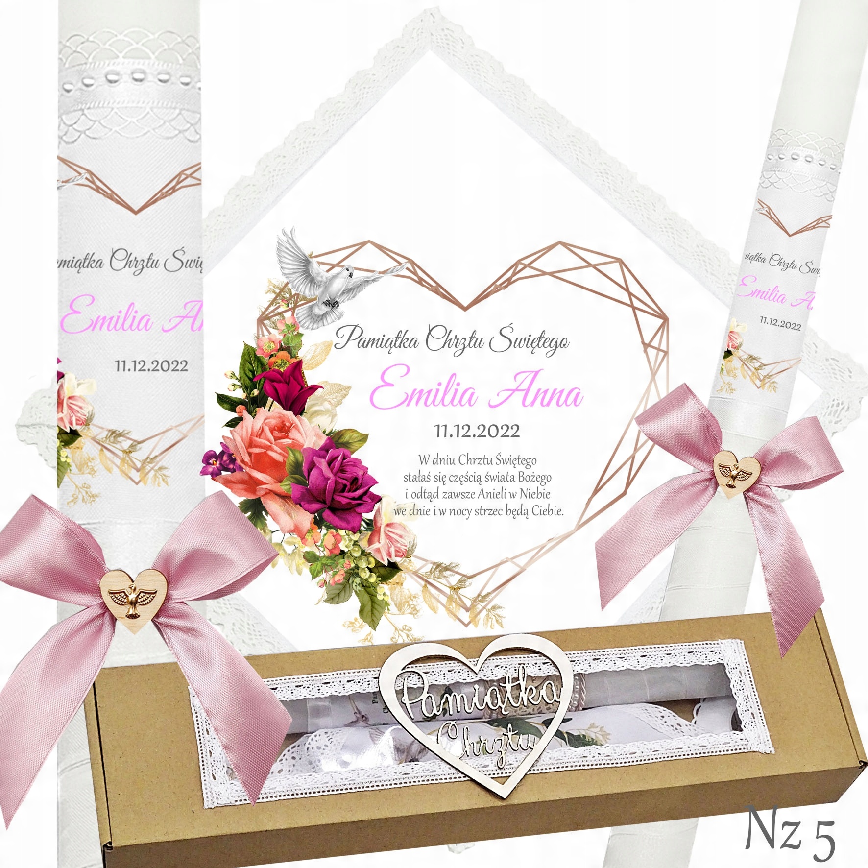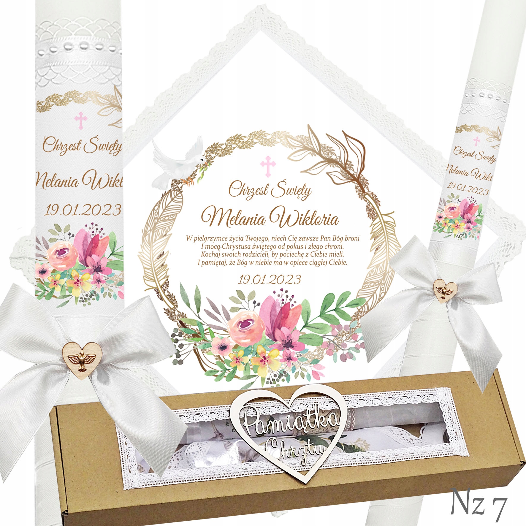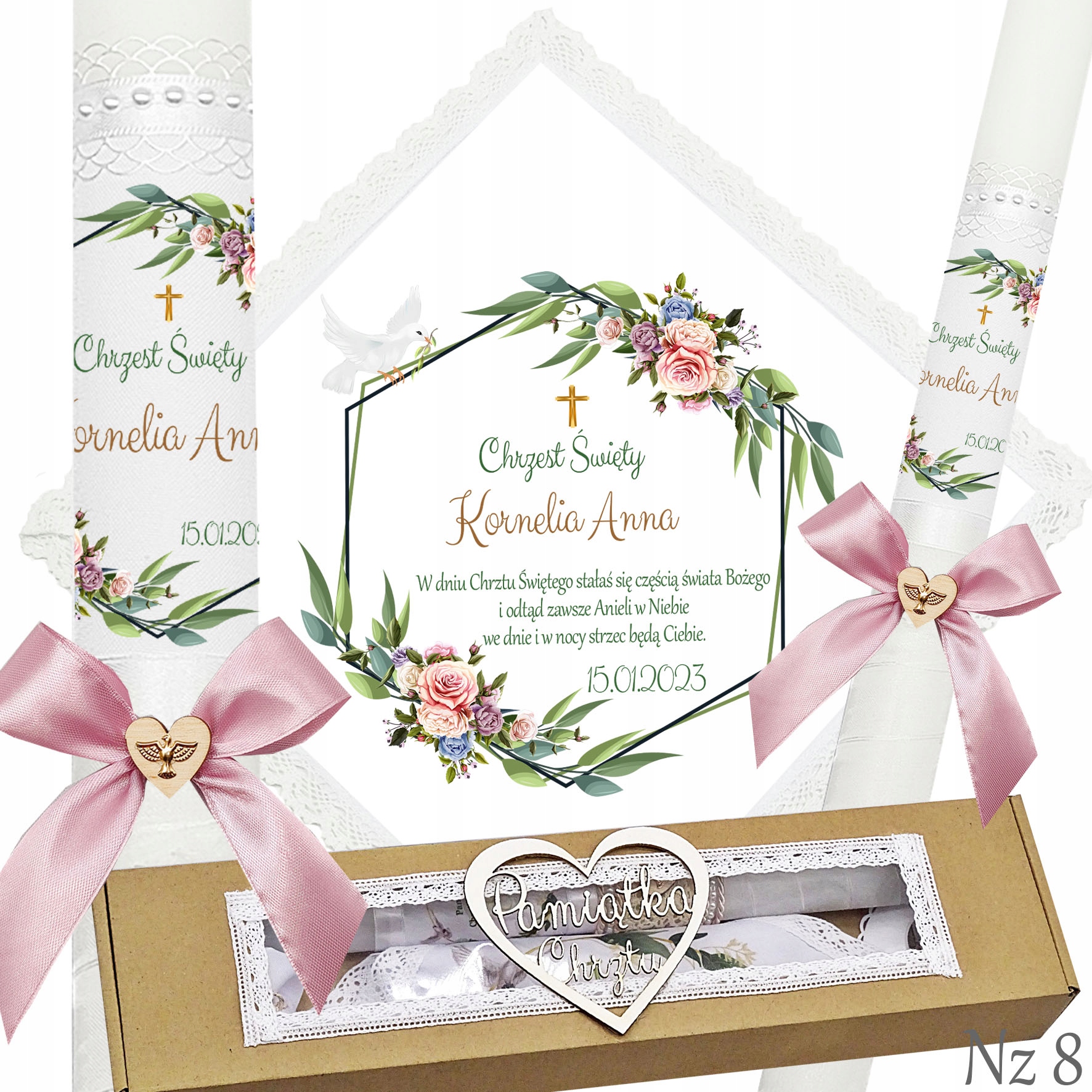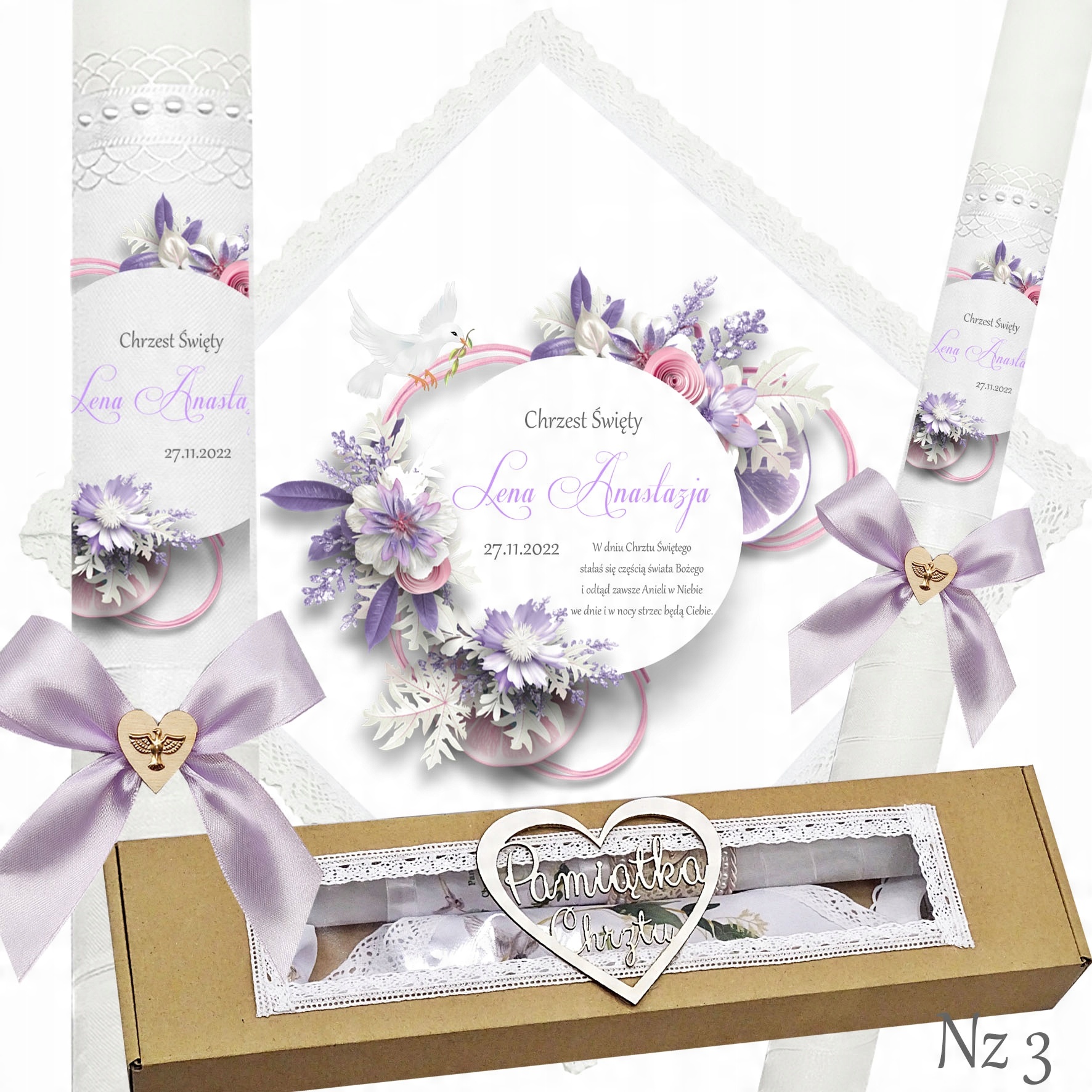 Представляємо надзвичайний набір для хрещення, що складається з ризи та свічки, ідеальний вибір для батьків які хочуть відсвяткувати цей особливий день елегантно та незабутньо. Свічка прикрашена білою шифоновою стрічкою, що додає їй неповторний характер і шарм. Верх свічки прикрашений атласним мереживом і білими перлами, що надає їй елегантності та шику. Лук з дерев'яним серцем і металевою золотою емблемою Святого Духа. додає чарівний і сентиментальний акцент.