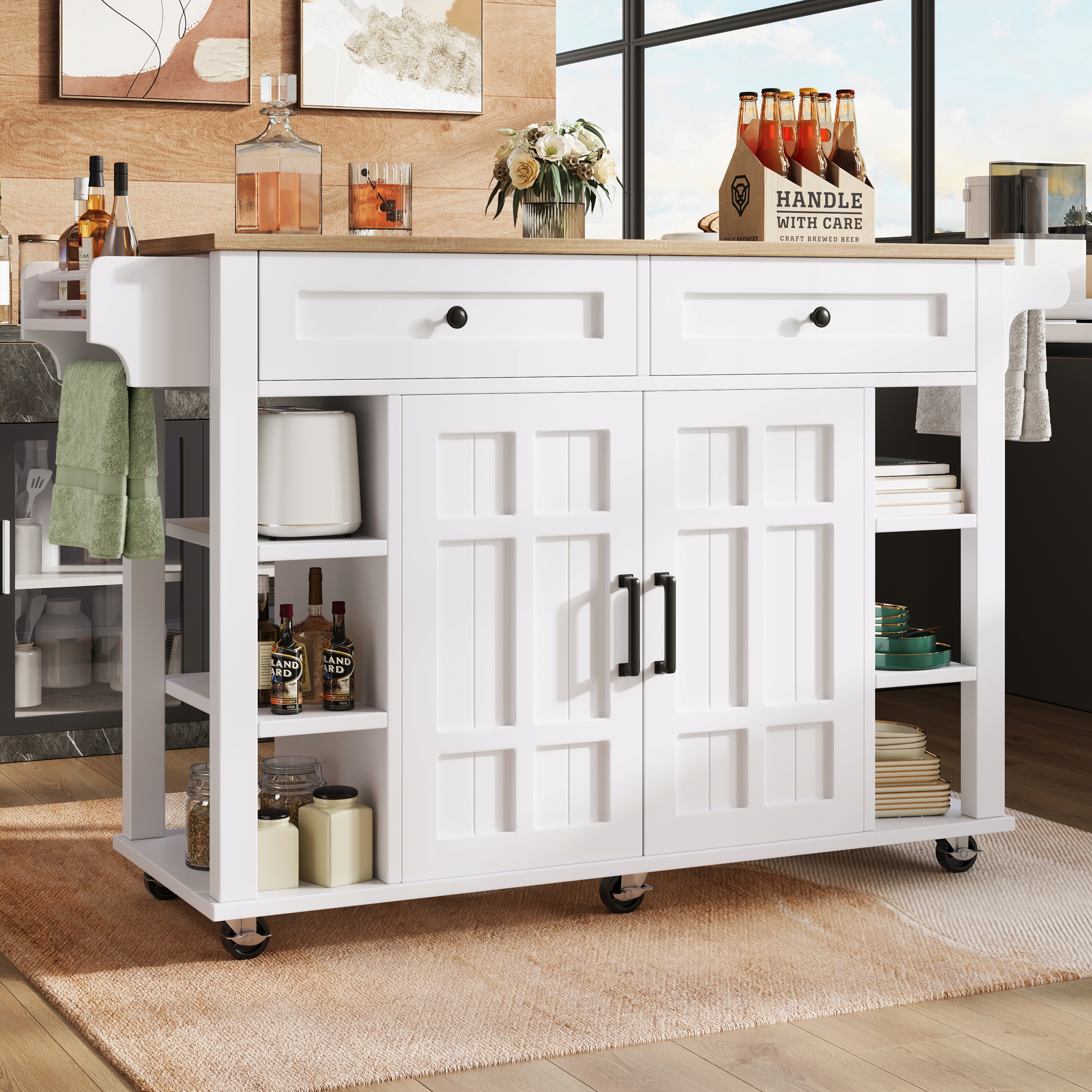 Біла кухонна острова з колесами, знімна полиця, дерев'яний вигляд та рушник -стійка