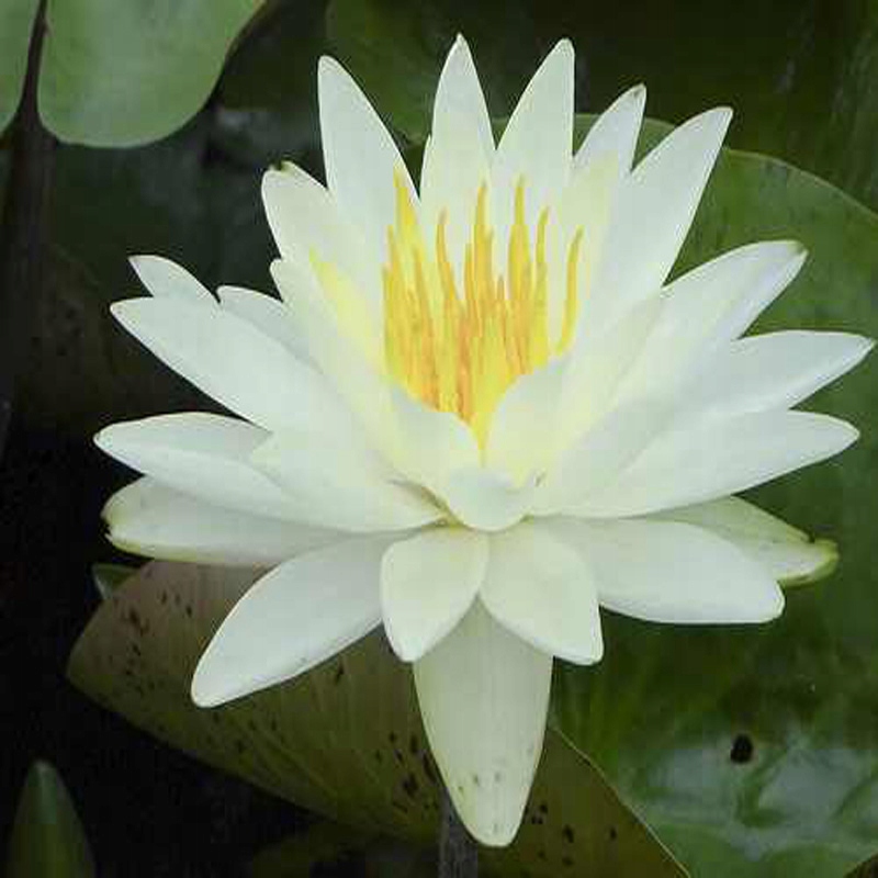 Великі квіти з подовженими білими пелюстками, жовті всередині, підняті приблизно на 5 см над поверхнею води і ароматні. Округле темно-зелене листя.