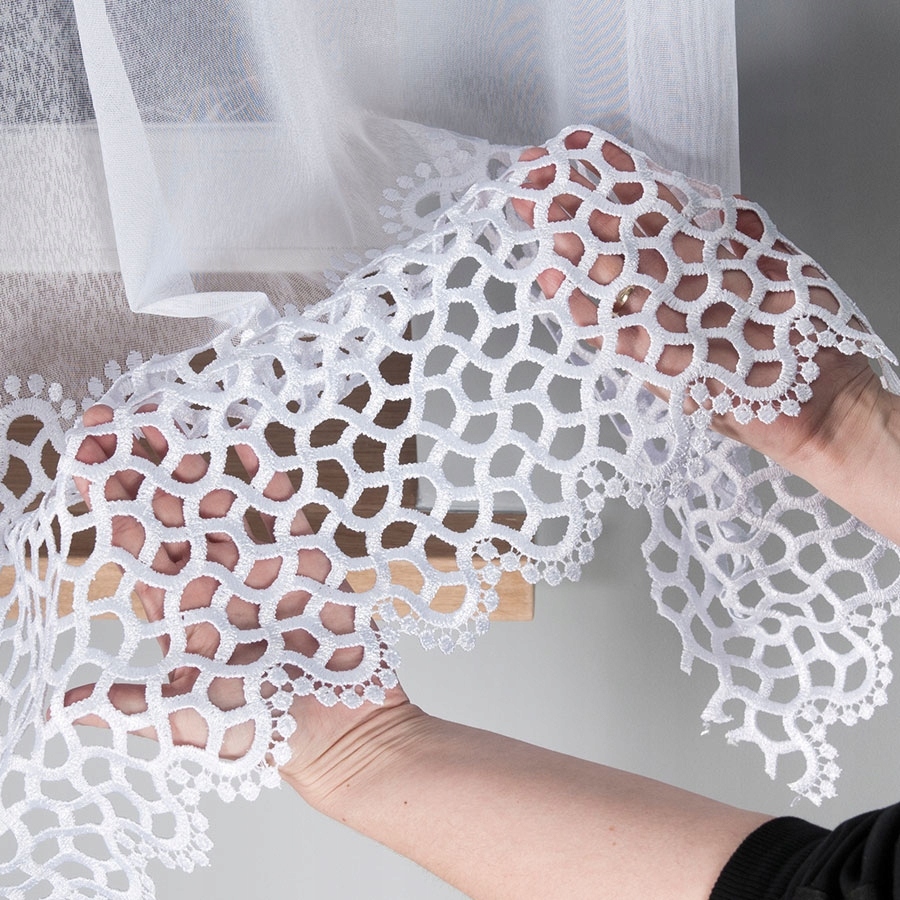 Білосніжна штора, прикрашена двома мереживними смужками, розташованими внизу і обробленими ніжною хвилею. Завдяки геометричному візерунку тканина підходить як для сучасних, так і для елегантних інтер'єрів. Матеріал пропускає багато світла, що означає, що нам не потрібно турбуватися про непотрібне затемнення. Ви можете повісити прикрасу як окремо, так і разом із комплектом штор, що забезпечить чудовий зовнішній вигляд та прикрасить весь інтер’єр.
